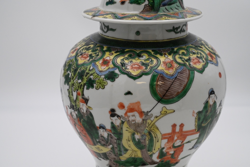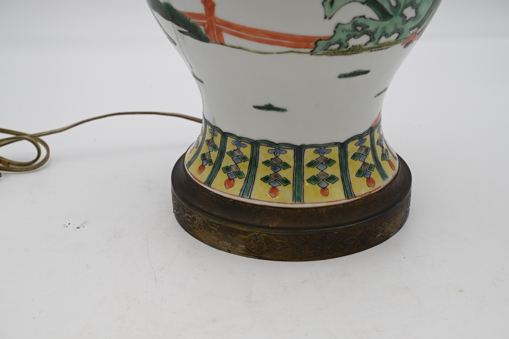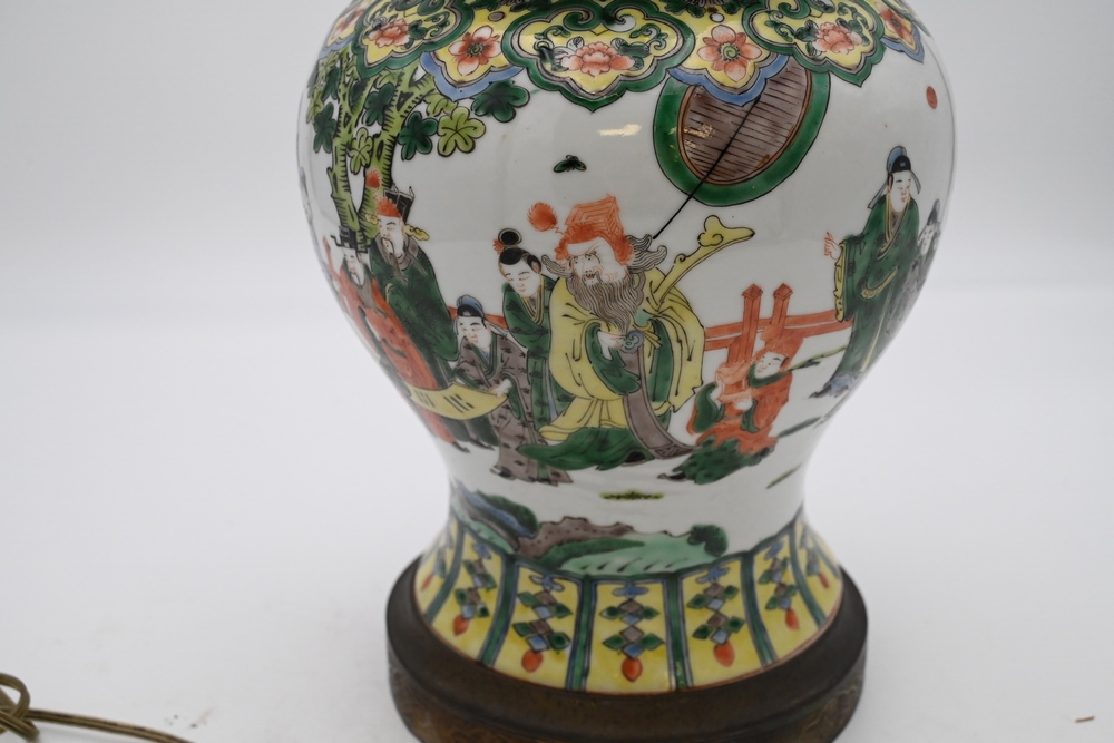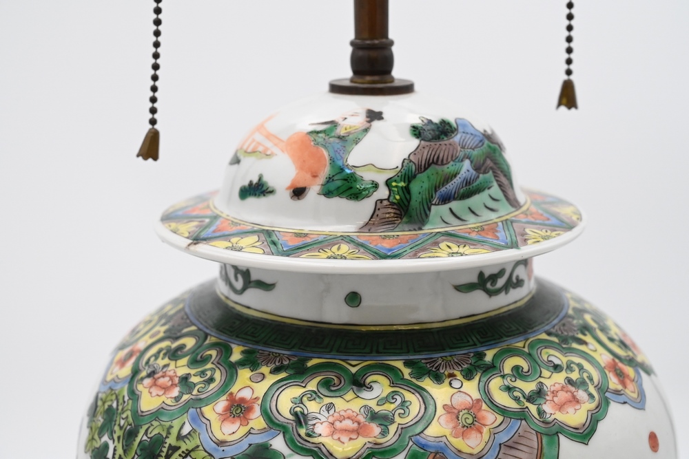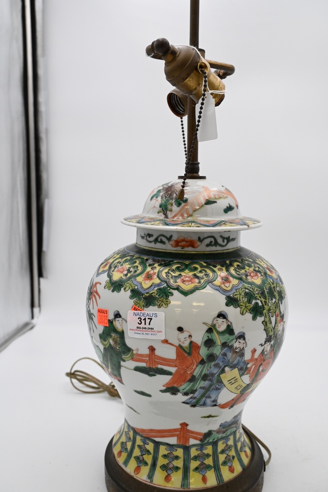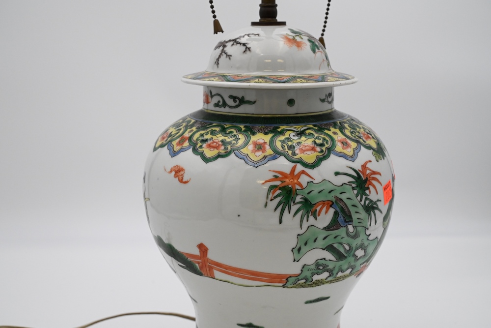 Lot 317: Chinese Famille Verte Porcelain Urn having painted courtyard scene with scholars made into a table lamp overall height 24 inches Provenance: Waterfront Estate, Stamford, Connecticut.