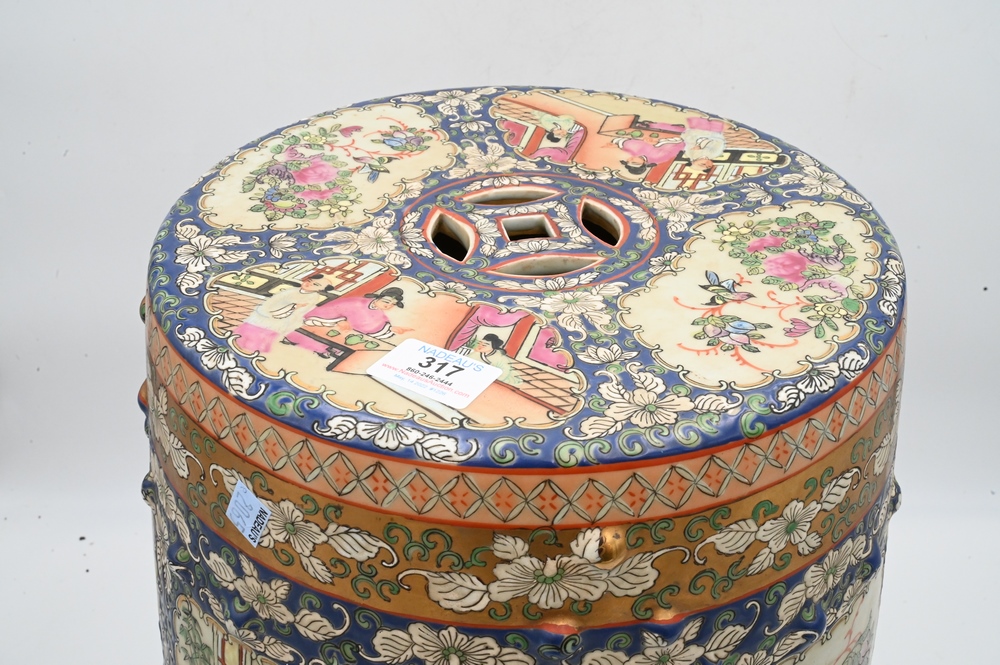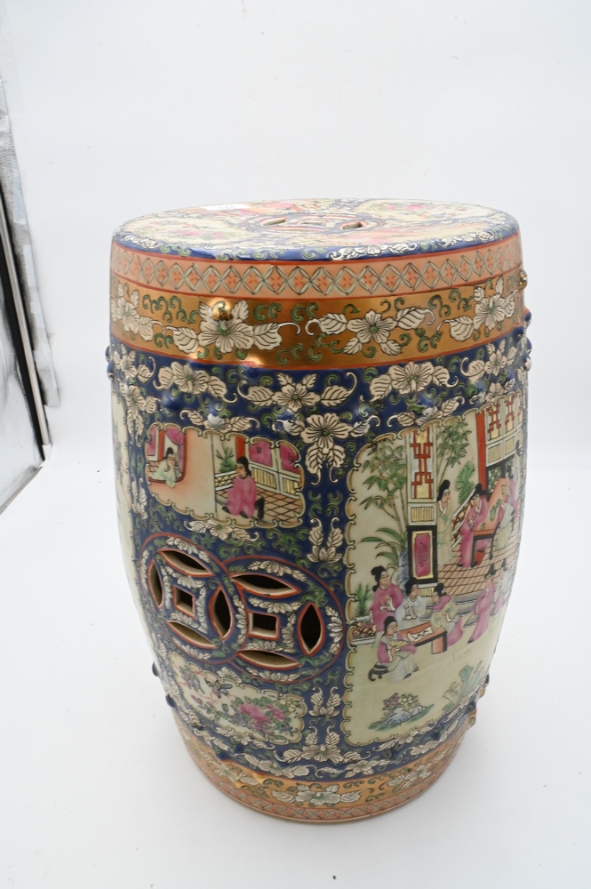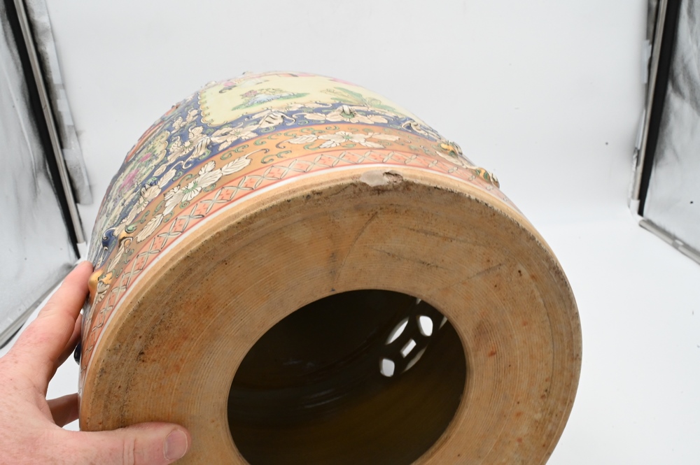 Lot 317: Chinese Porcelain Garden Seat, having painted panels of figures in courtyard, height 19 inches. Provenance: An estate from Redding, CT.