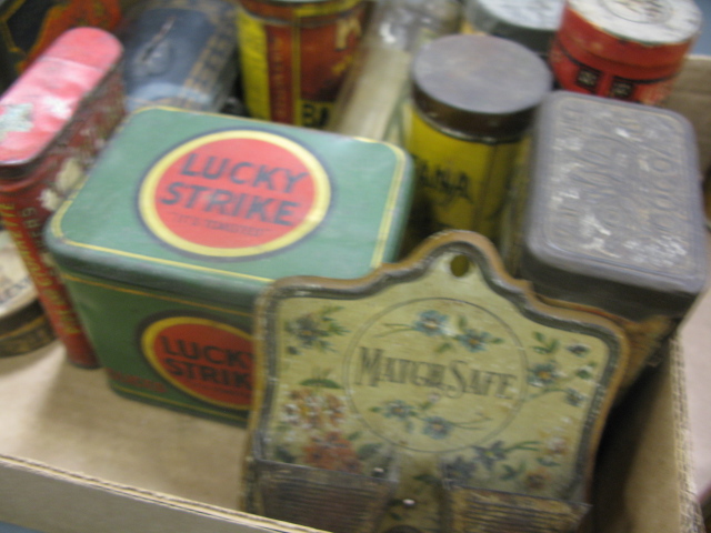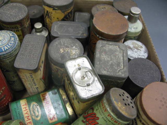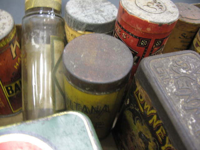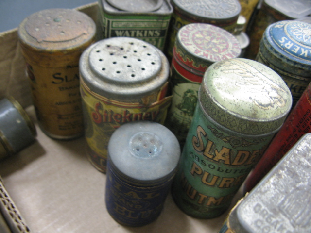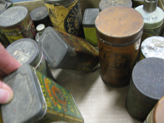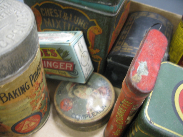 Collection of early tins with painted and paper labels.
