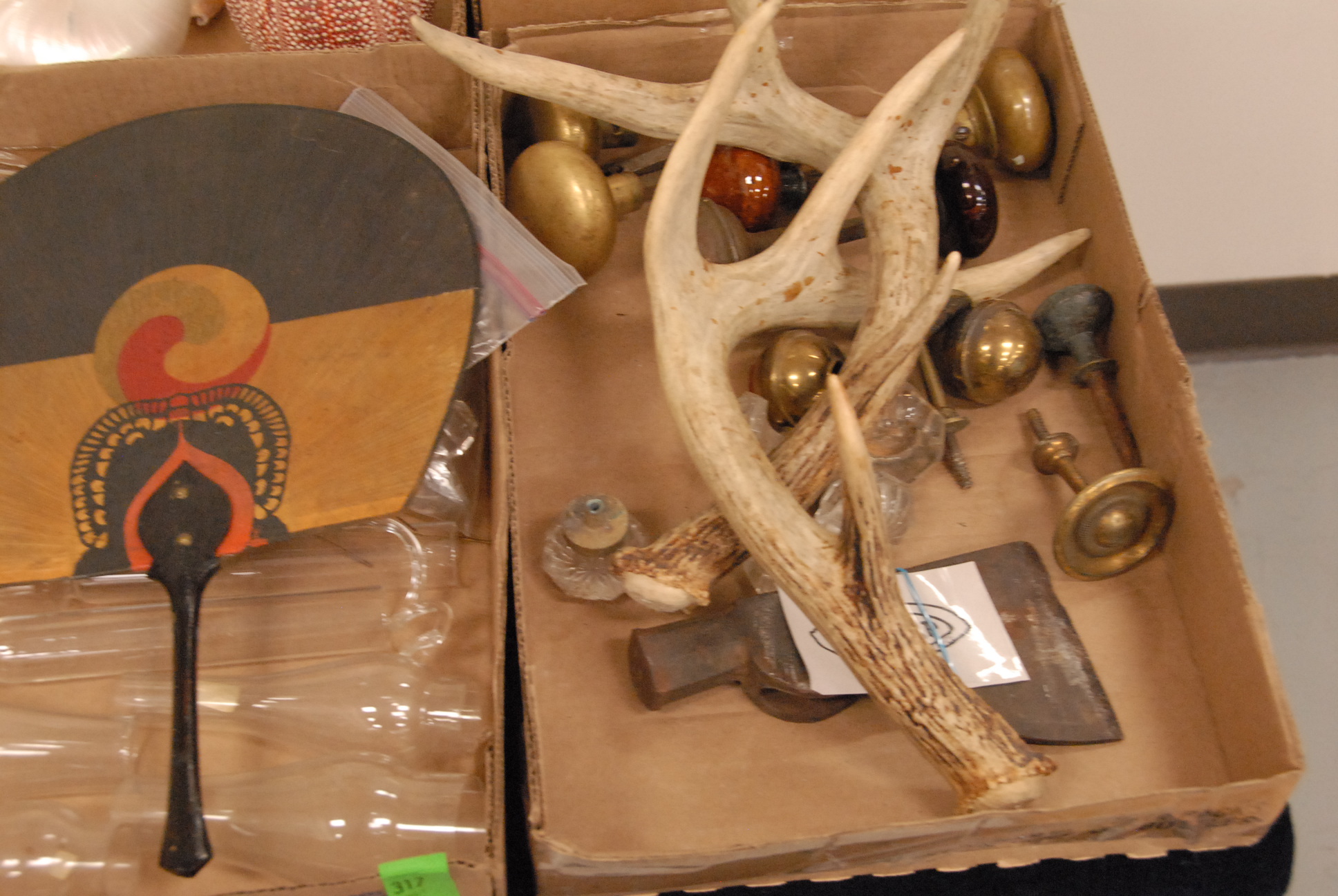 Four box lots to include various door knobs, chimneys, crystal, coral, shell collection, and an unusual Oriental fan.