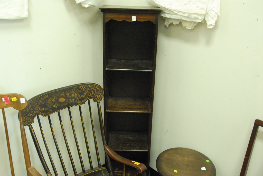 Lot 317: Group lot of six pieces small throw rug, two rocking chairs, small bookcase, piano stool, and chair.