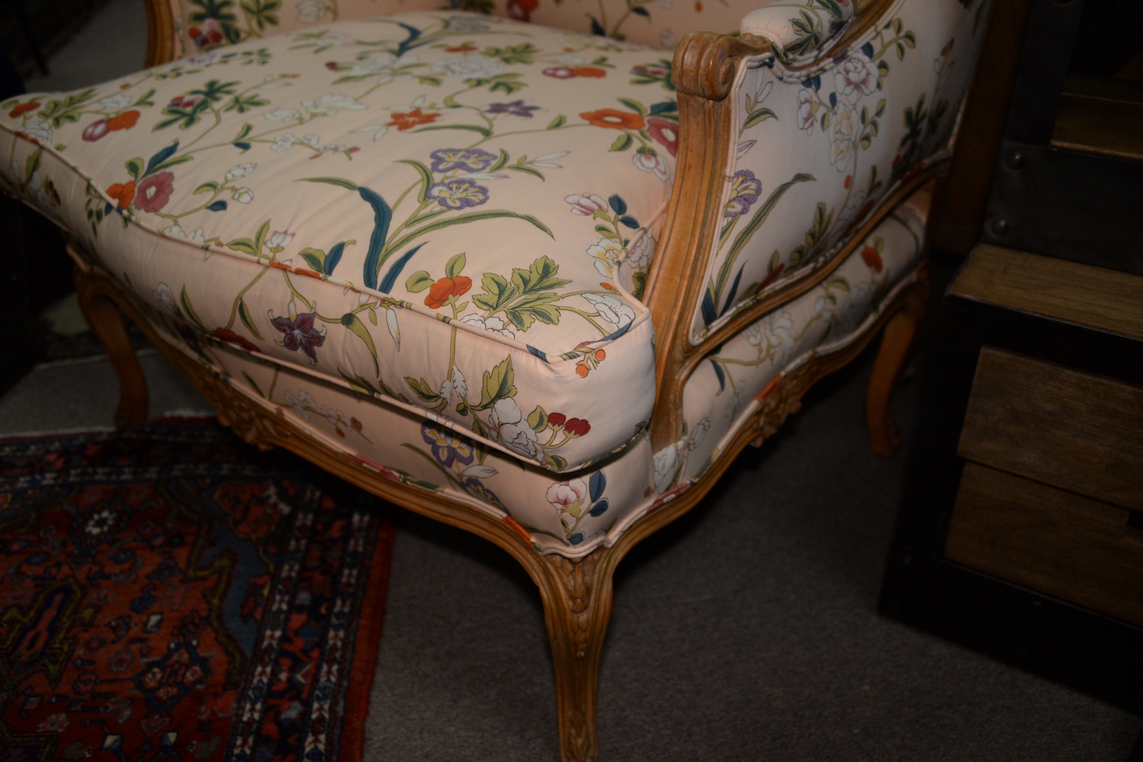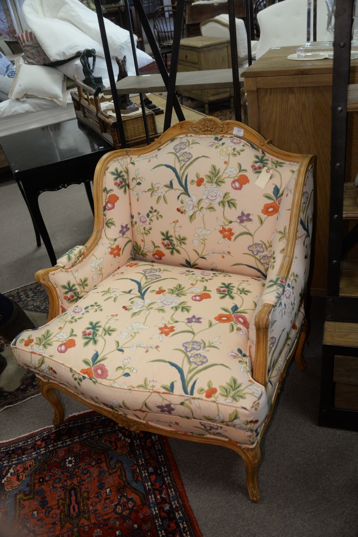 Louis XV Style Bergere with custom upholstery height 39 1/2 inches, width 34 inches