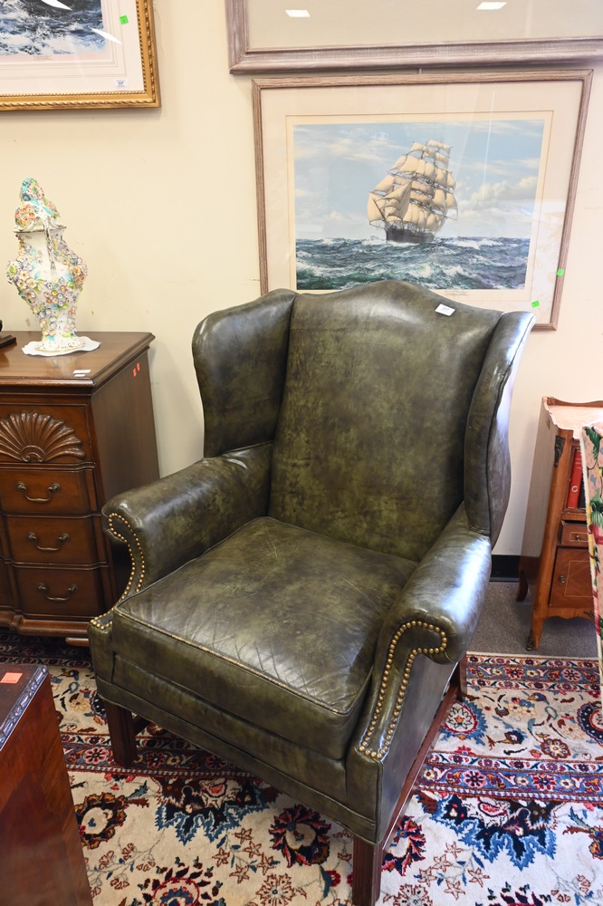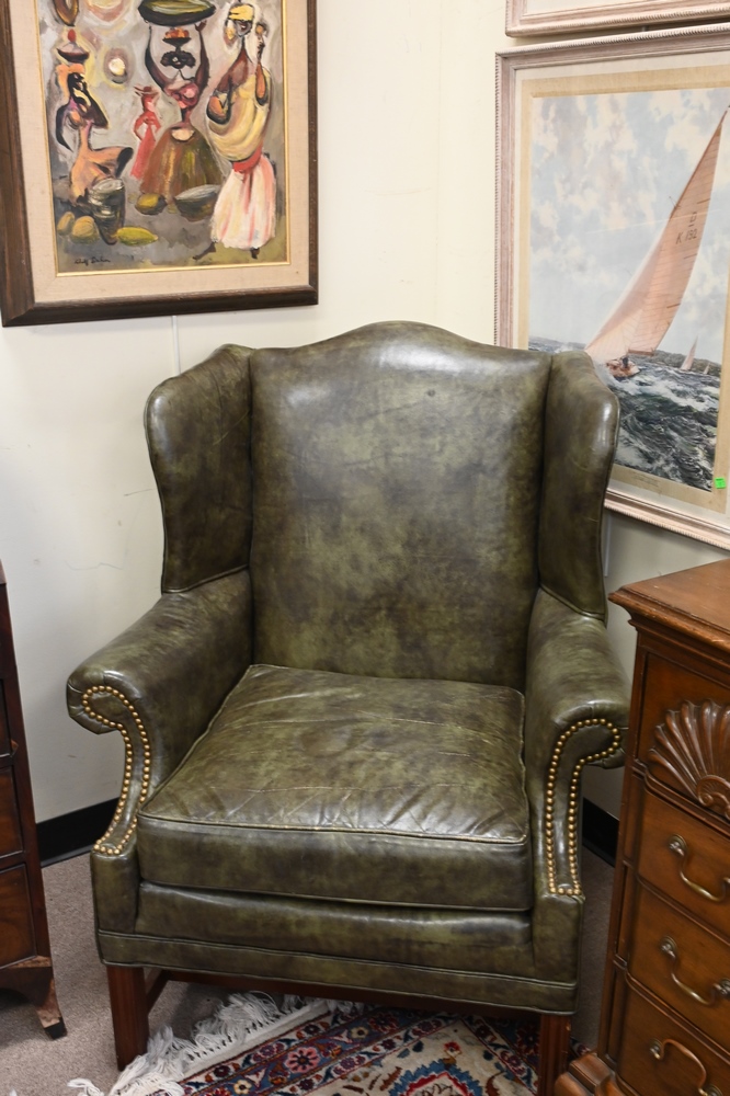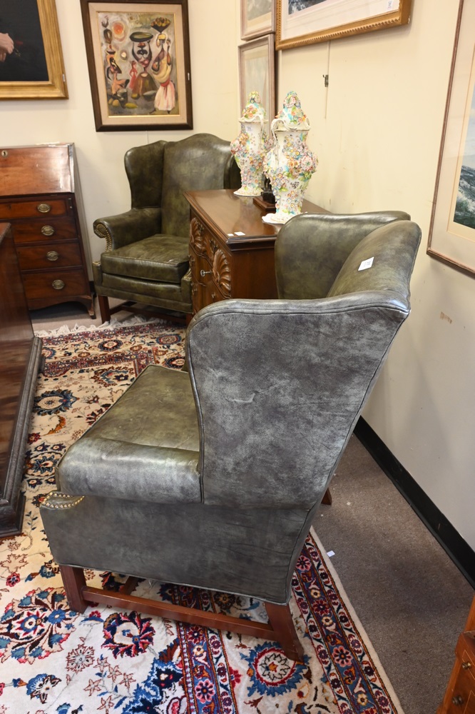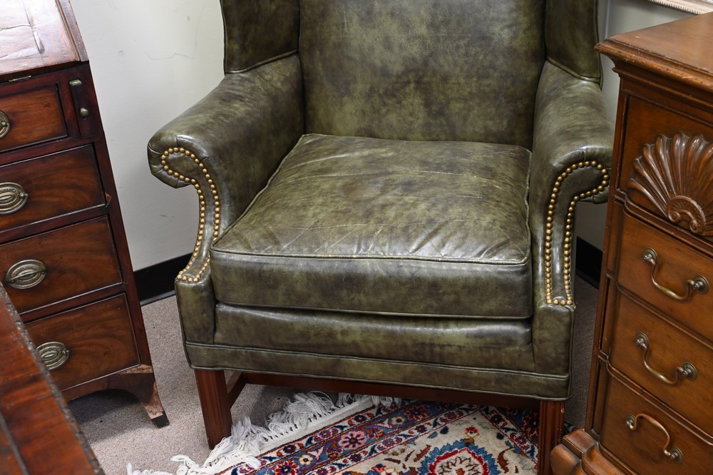 Lot 317: Pair of Chippendale Style Leather Upholstered Wing Chairs, on square molded legs, height 42 inches, width 35 inches, minor imperfections.
