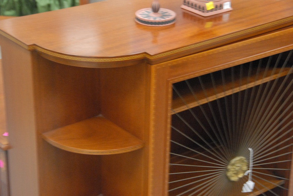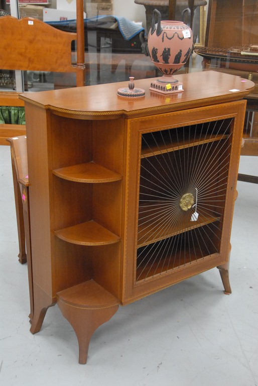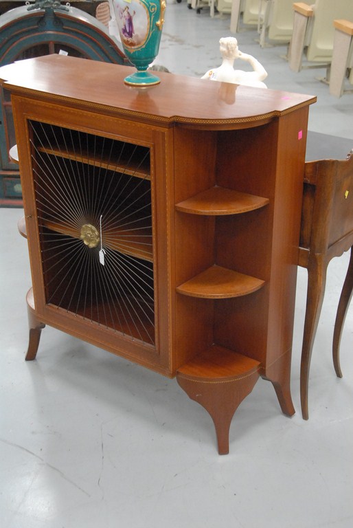 Pair of Margolis mahogany bookcases having D shaped top over conforming cabinet with grill work door flanked by open side shelves all with dart inlaid edges all set on flared French feet, signed on reverse with brand mark Harold Margolis. ht. 39in. wd. 38in. dp. 15in.