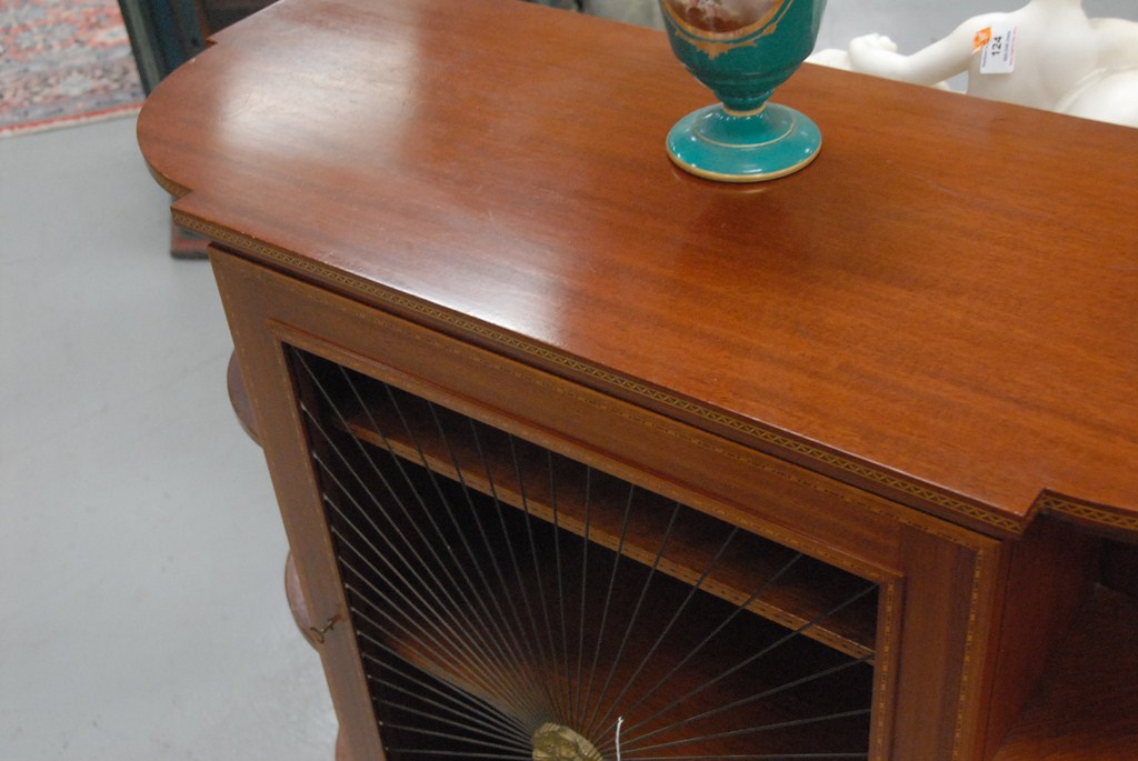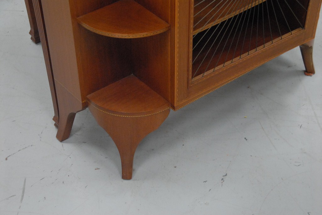 Lot 317: Pair of Margolis mahogany bookcases having D shaped top over conforming cabinet with grill work door flanked by open side shelves al…