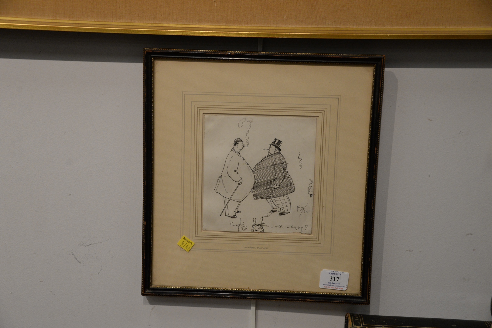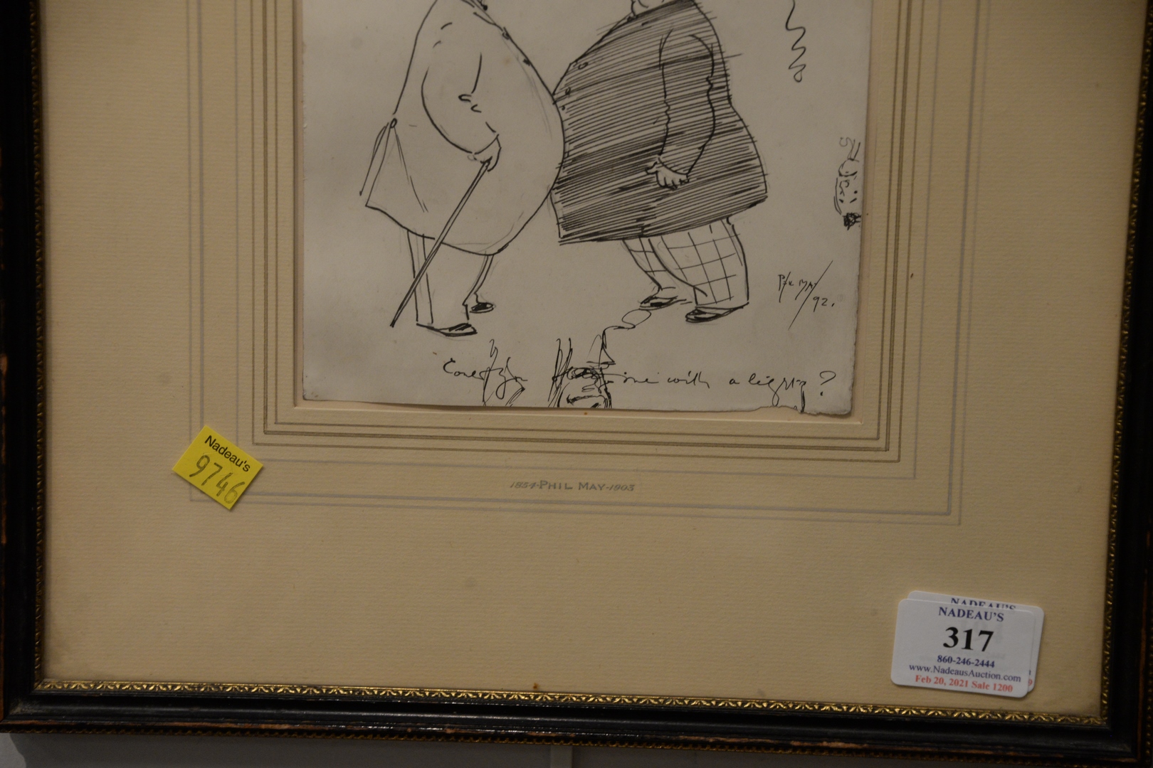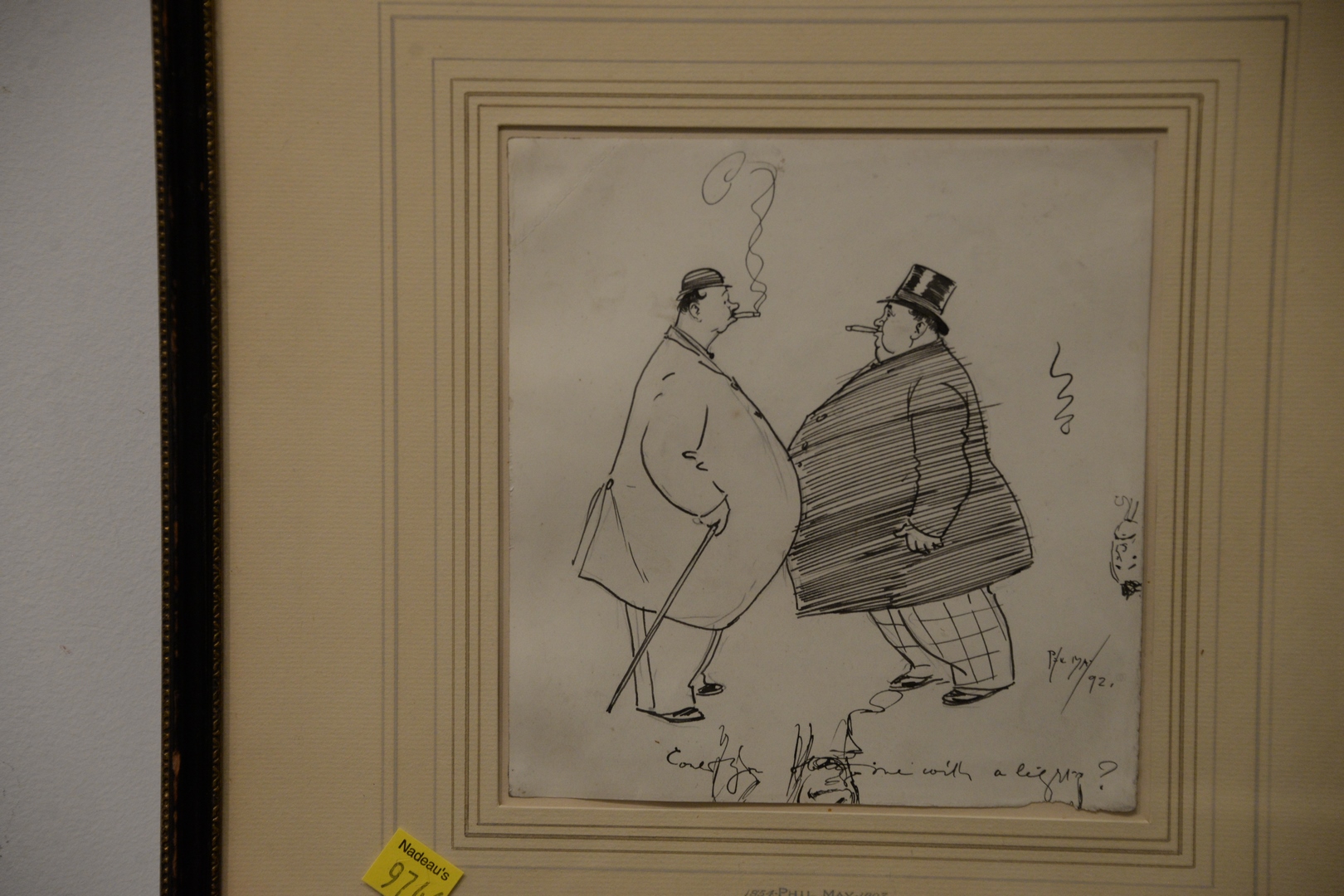 Lot 317: Philip William May (1864 – 1903), two large figures smoking cigars, pen and ink on paper, signed: Phil. May 92, Leonard Clayton, New York label verso, 6-1/2″ x 6″ (sheet).