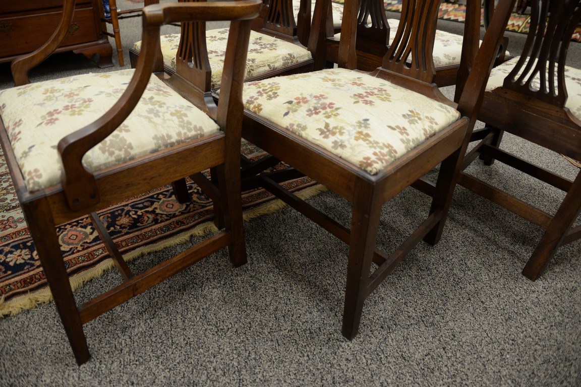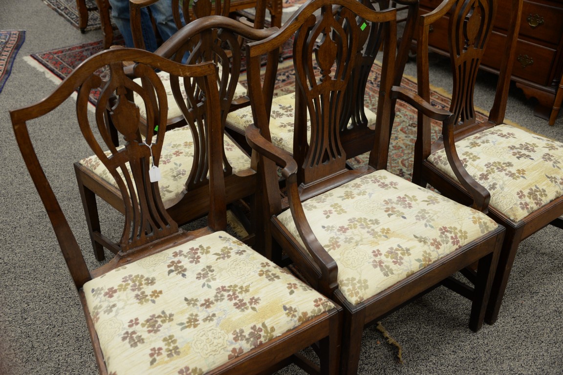 Lot 317: Set of six Federal mahogany dining chairs each with CT style back with urn and slip seats set on squared tapered legs, circa 1800.