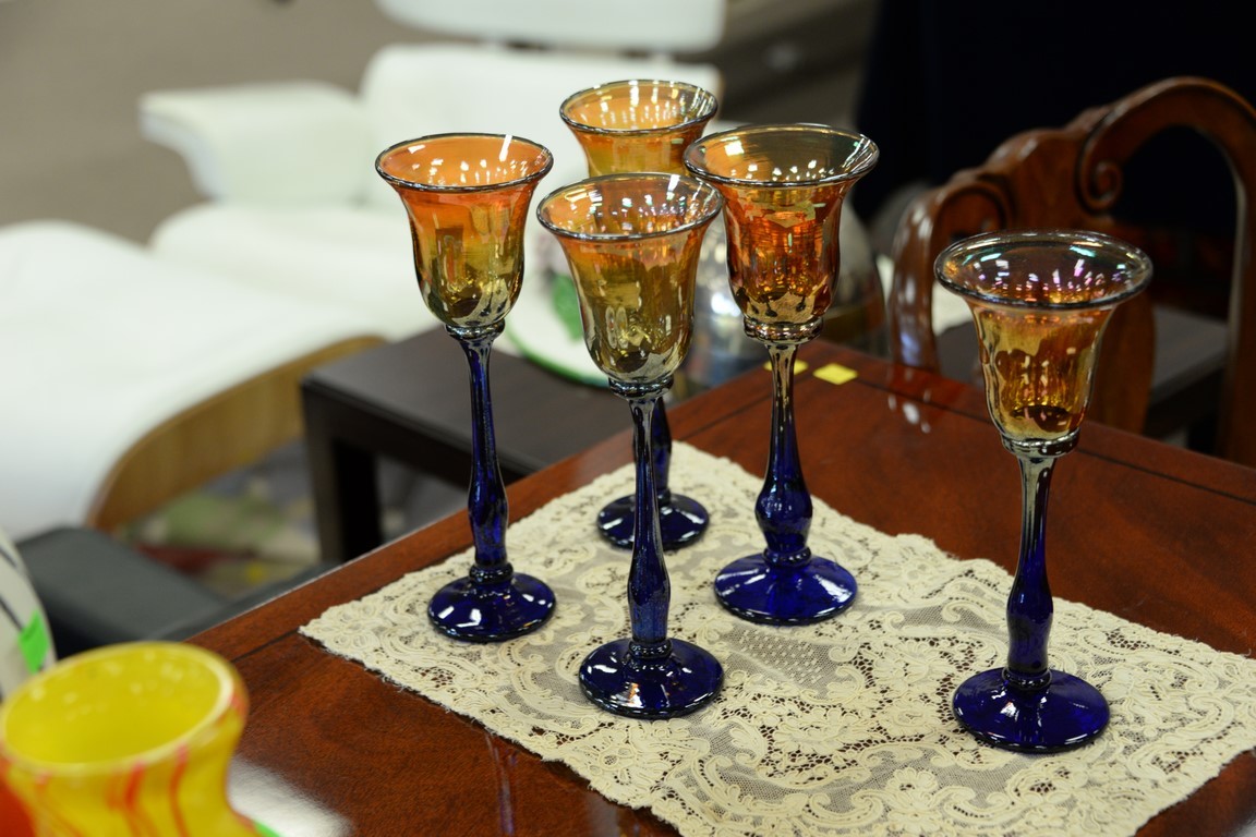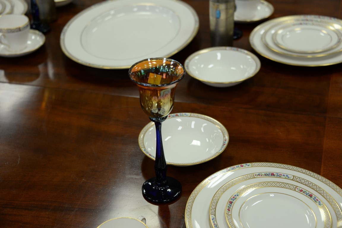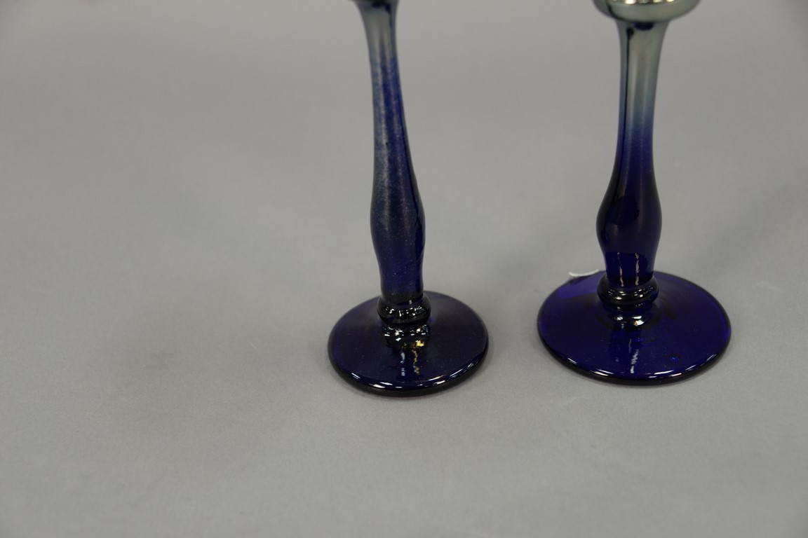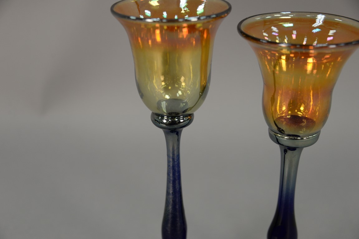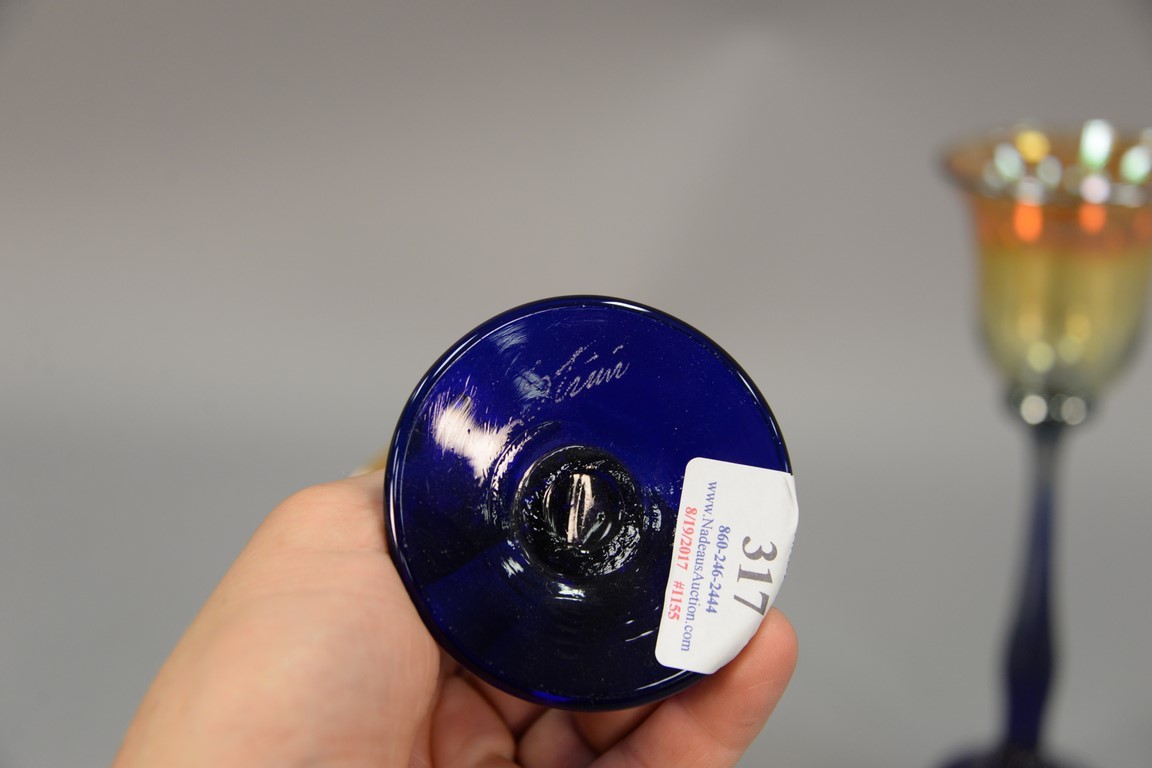 Lot 317: Set of thirteen Rick Strini art glass stemware, amber to cobalt with luster over glaze, signed on bottom Strini. ht. 8 3/4in.