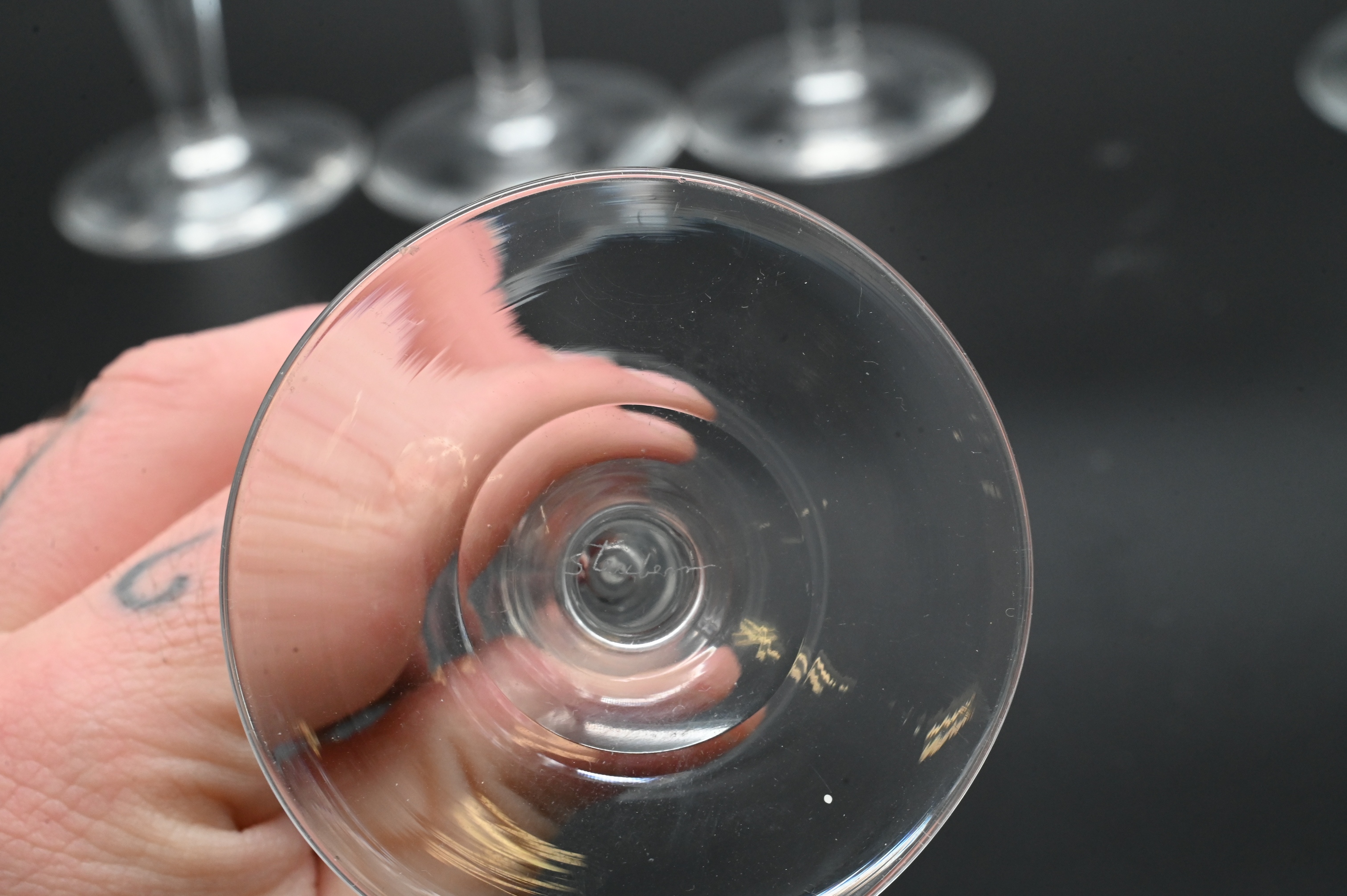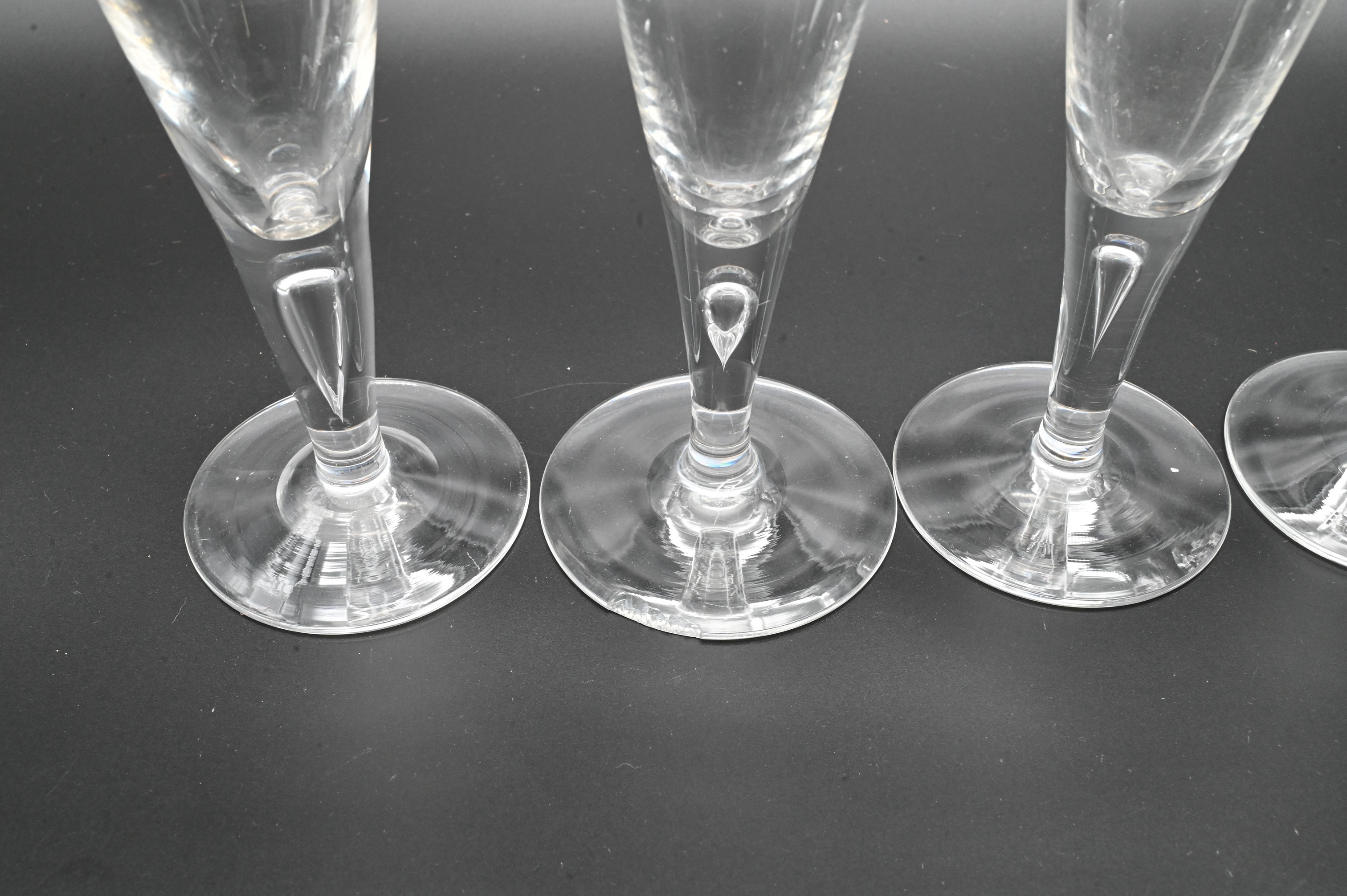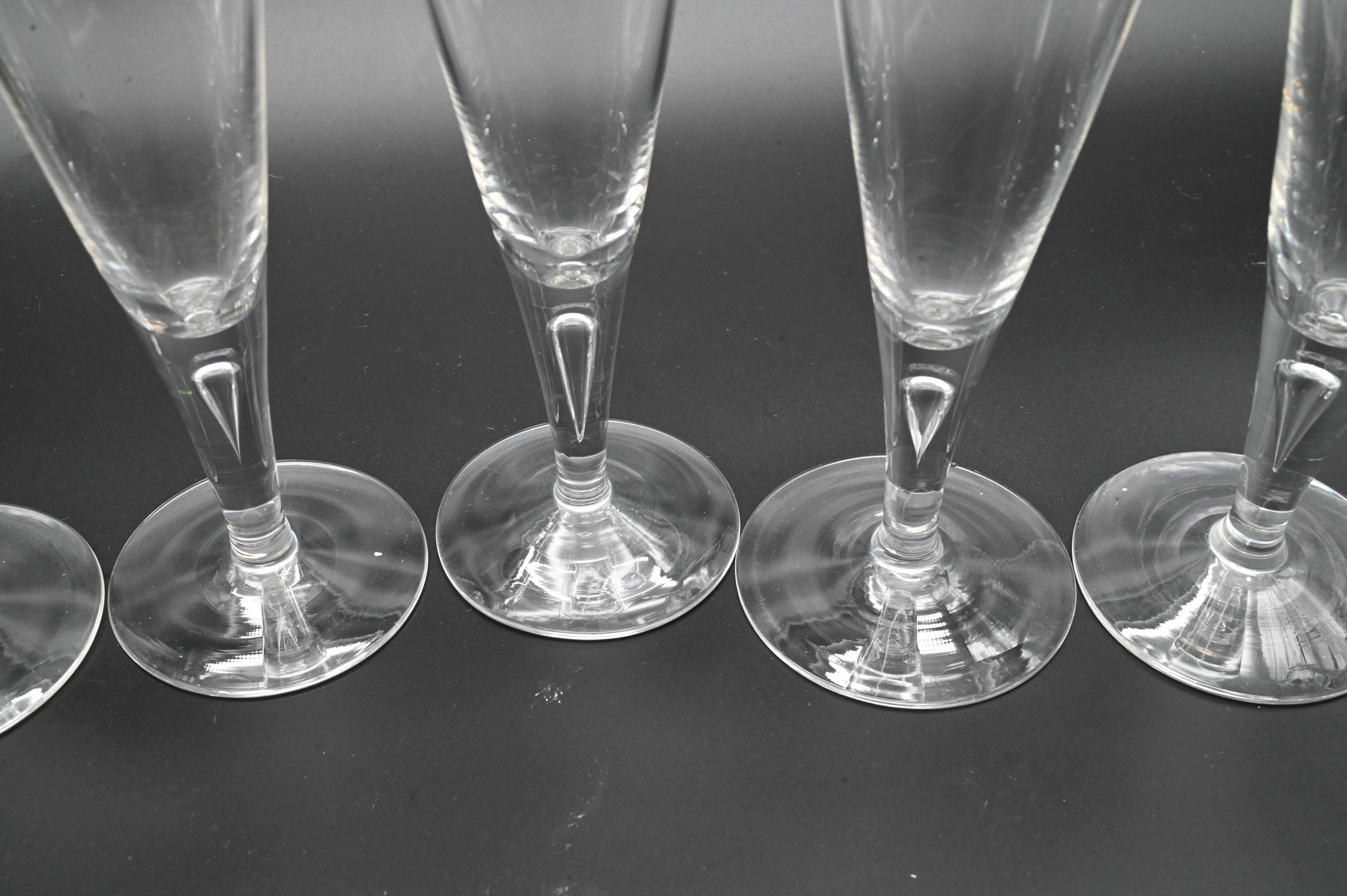 in pattern no. 7924, featuring a tall, flared bowl and clear stem enclosing a controlled teardrop air bubble, etched Steuben mark to base; two with chips to base
