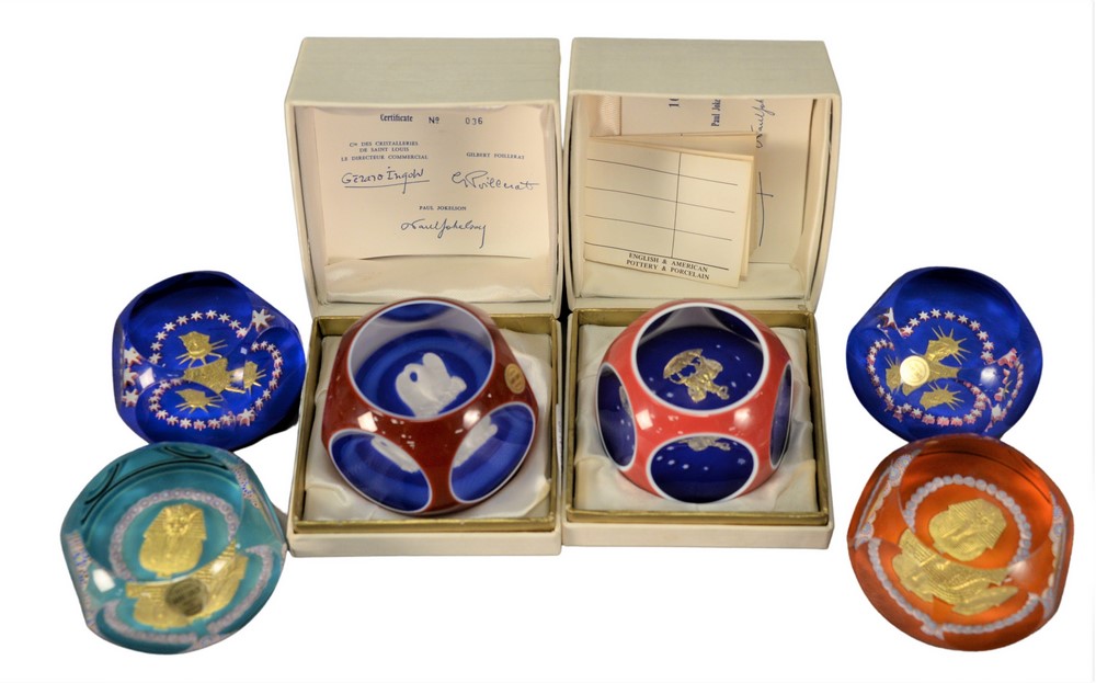 Six Saint Louis Glass Paperweights, to include two having Pharoah figures with Millefiori interiors, two with Statue of Liberty interiors; along with two red exterior and blue ground paperweights having an eagle in one and George Washington in the other, two with their original fitted boxes, diameter of largest 3 inches. Provenance: Estate of James Wadhams.