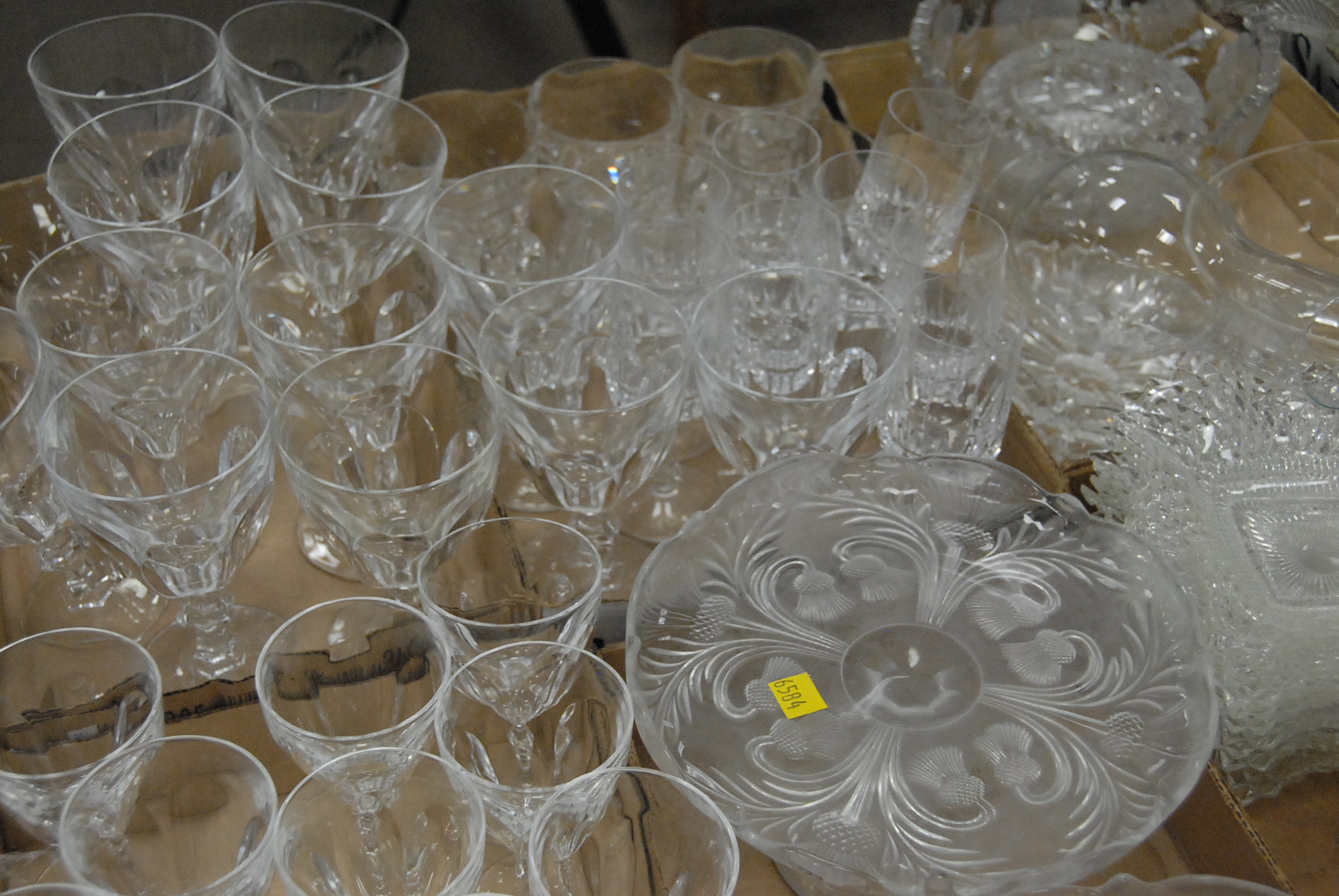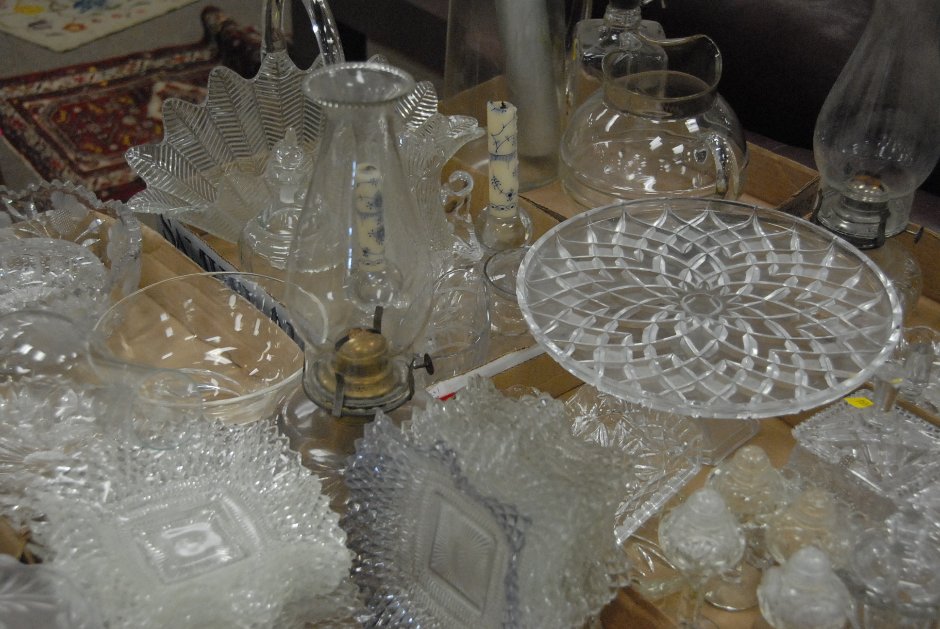 Lot 317: Ten box lots of clear glass, cut glass, crystal, pressed glass, stemware, compotes, bowls, dishes, plates, pitcher, basket, etc.