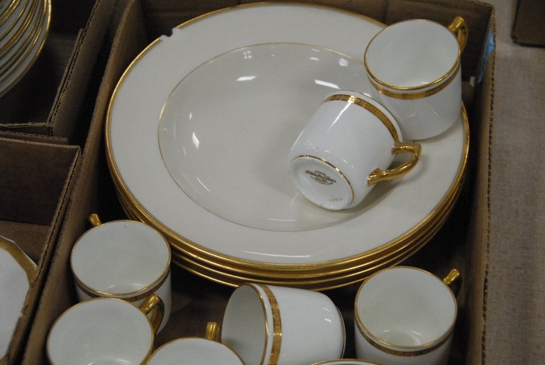 Three box lots gold trimmed soup bowls, demitasse cups and saucers, small group of Lenox bowls.