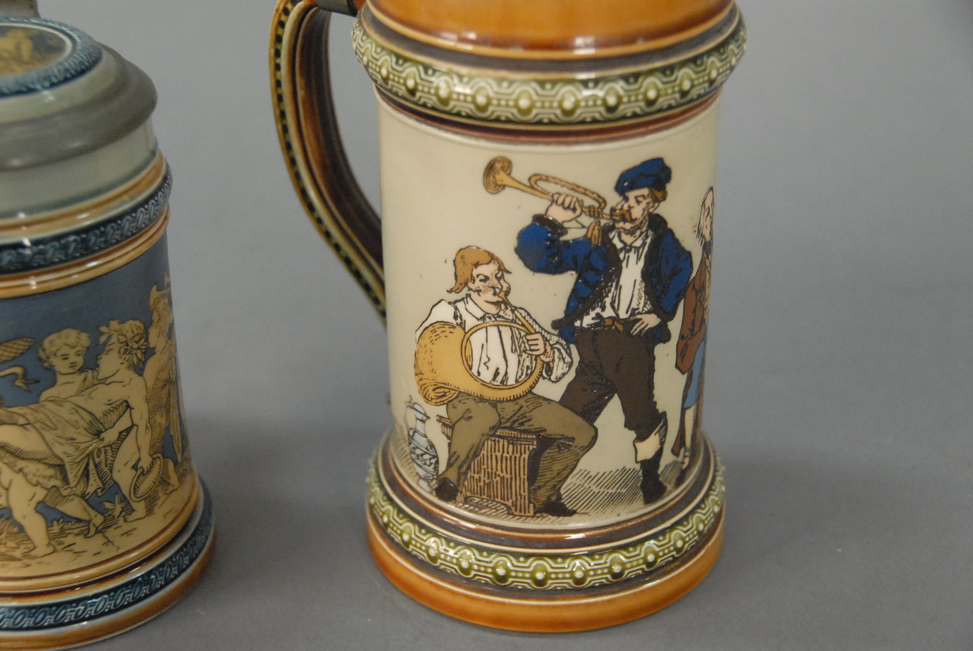 Lot 317: Two Mettlach Geschurzt steins #2025 3/10th litre, and #1471 1/2 litre., ht.s 8 1/2in. & 6 3/4in.