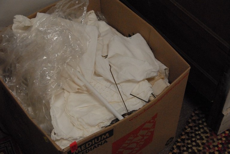 Box of linens and tablecloths. Provenance: Estate of Judy Gengras McDonough of West Hartford, CT.