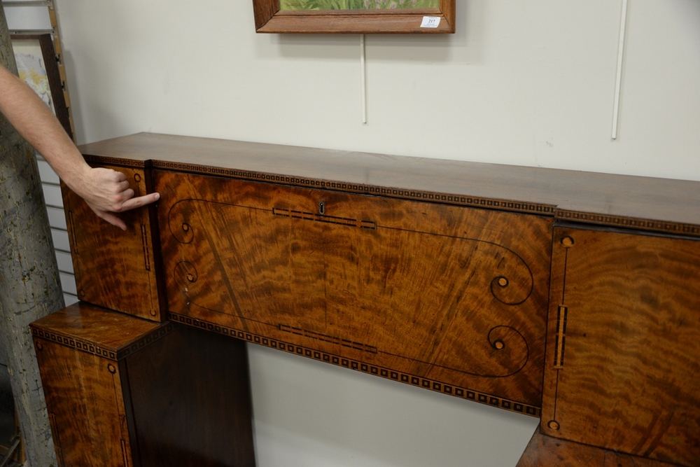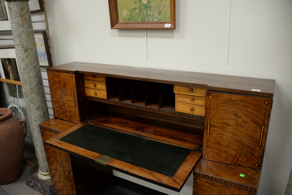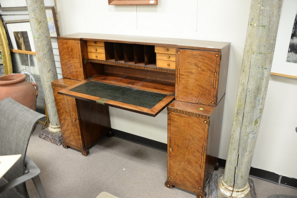 Continental Inlaid Desk, having drop front top over side cabinets (one foot missing), height 45 1/2 inches, length 61 inches