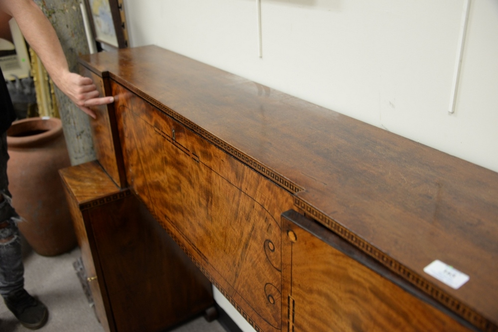 Lot 318: Continental Inlaid Desk, having drop front top over side cabinets (one foot missing), height 45 1/2 inches, length 61 inches