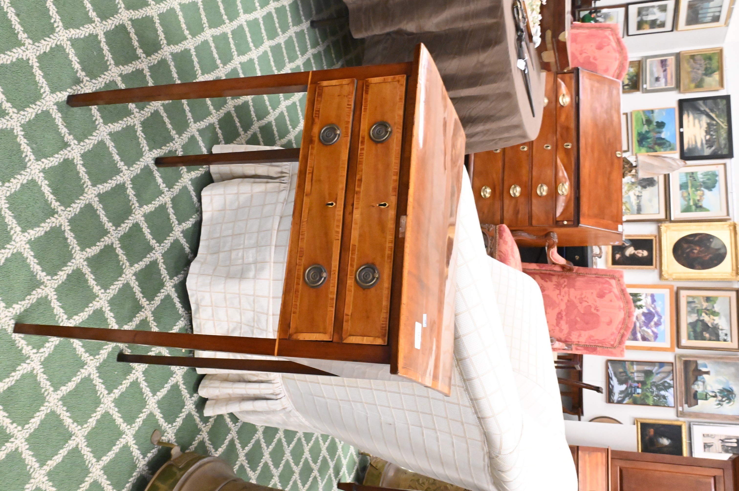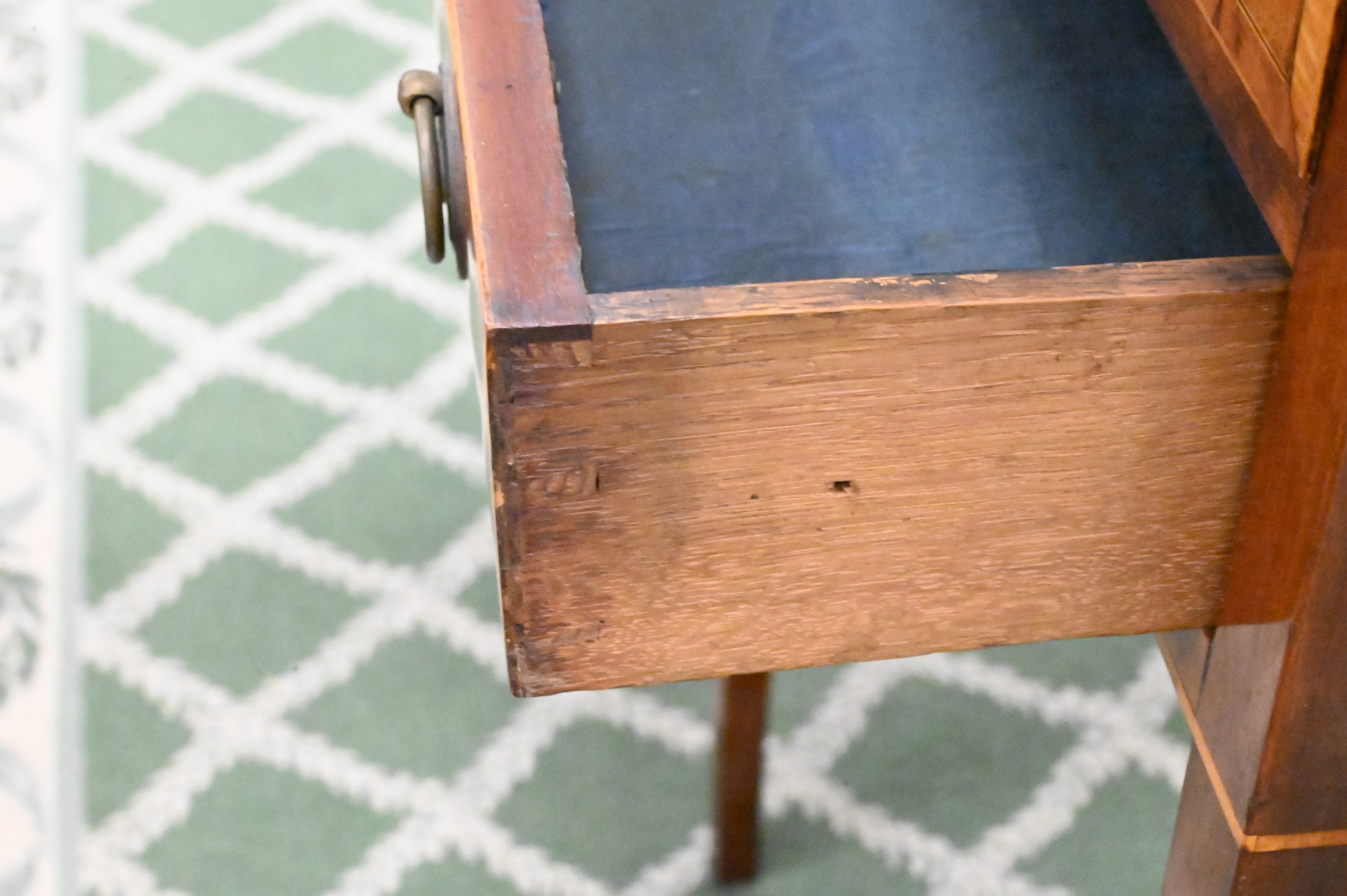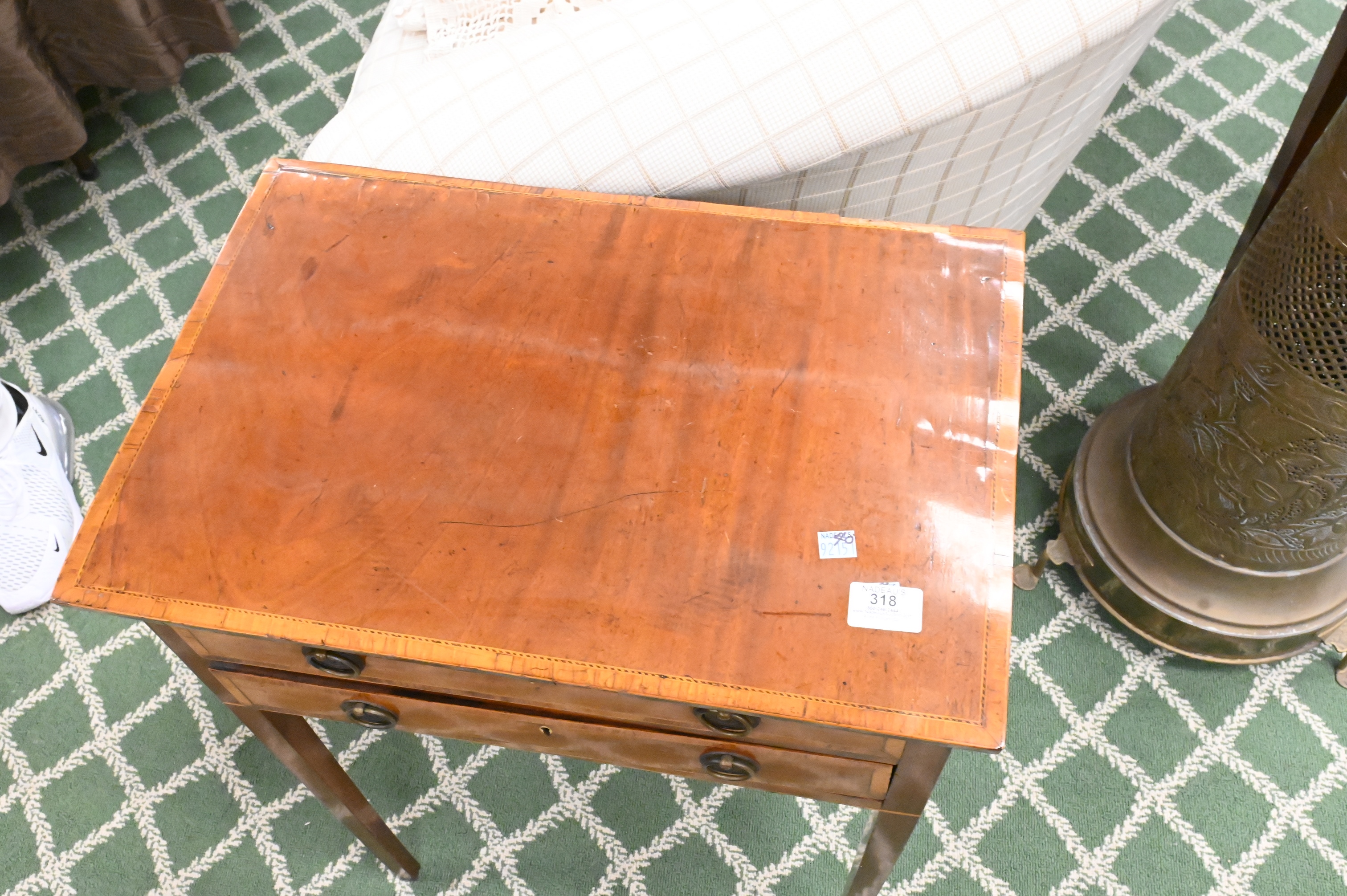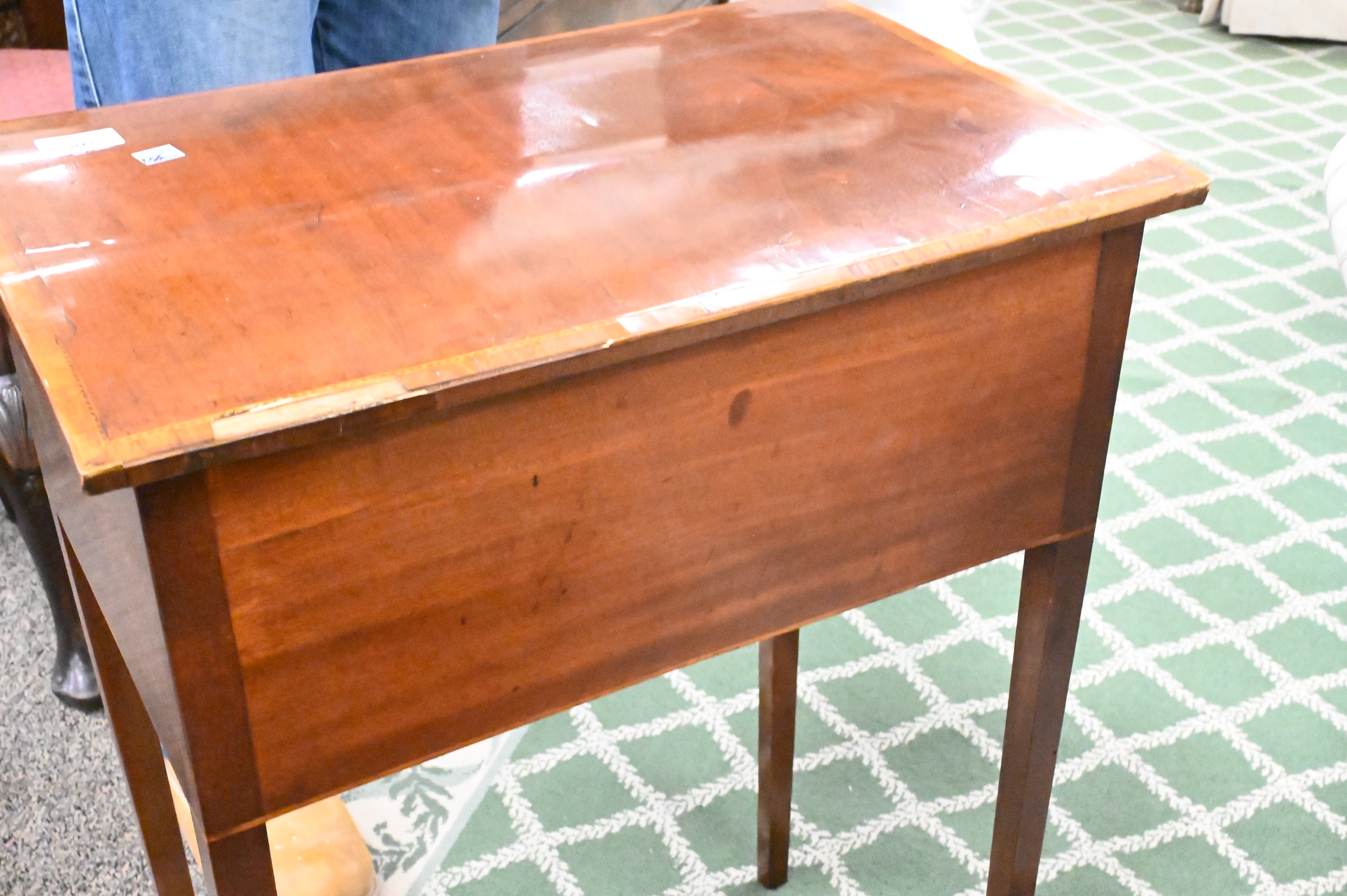 having two drawers set on tapered legs, minor inlay loss
