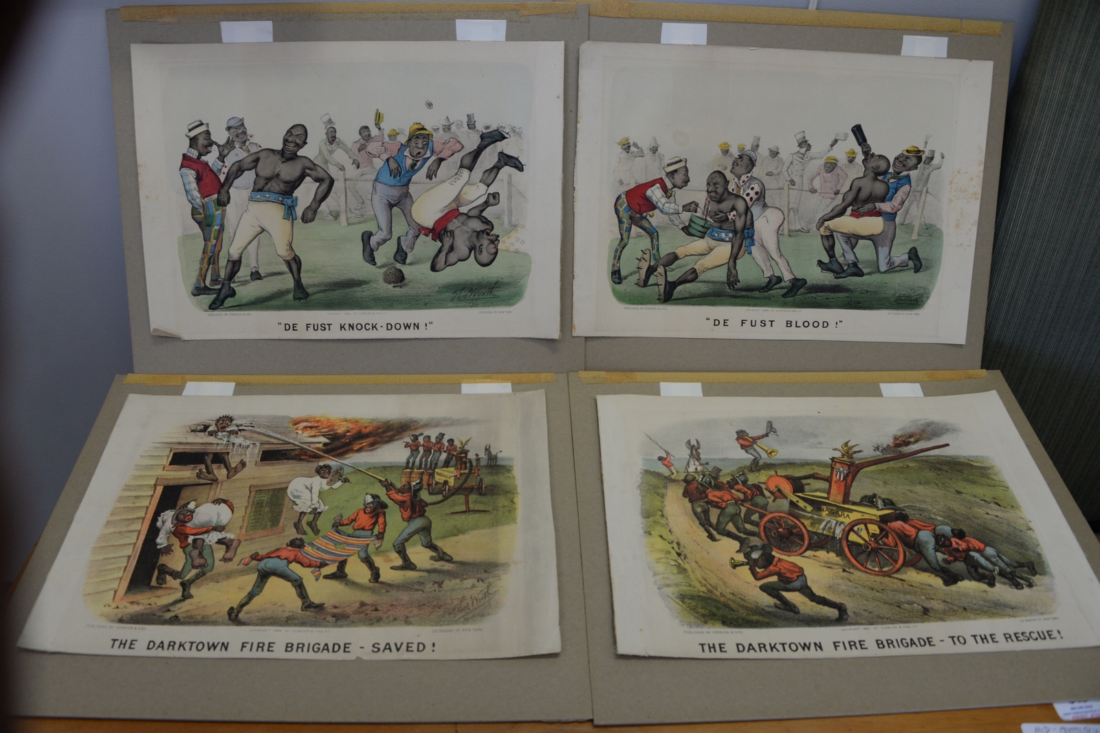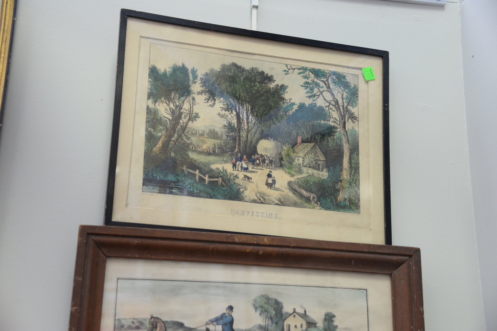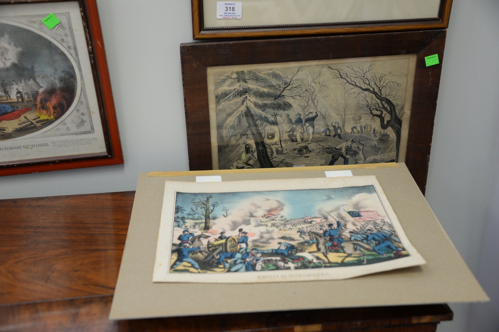 Five Currier and Ives small folio colored lithographs including A Fast Team – Taking a Smash, Christmas Snow, Harvesting, Landing of the Pilgrims at Plymouth 11th Dec 1620, and Battle of Chickamauga. images sizes 5 x 8 to 8 x 13.