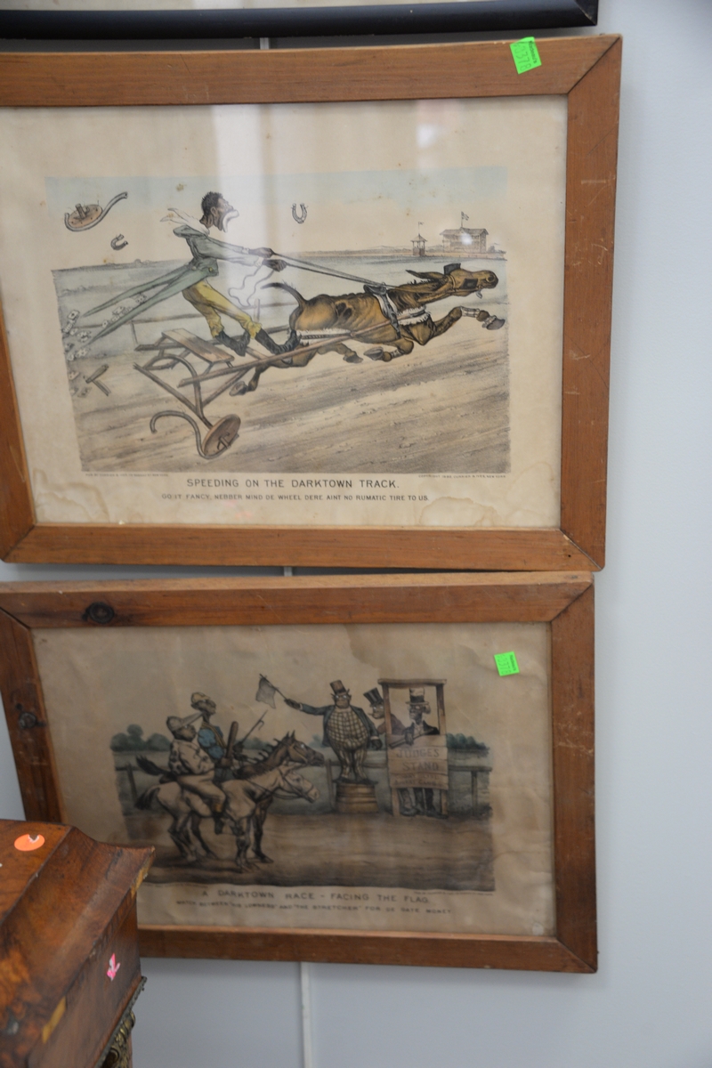 Lot 318: Five Currier and Ives small folio colored lithographs including A Fast Team – Taking a Smash, Christmas Snow, Harvesting, Lan…
