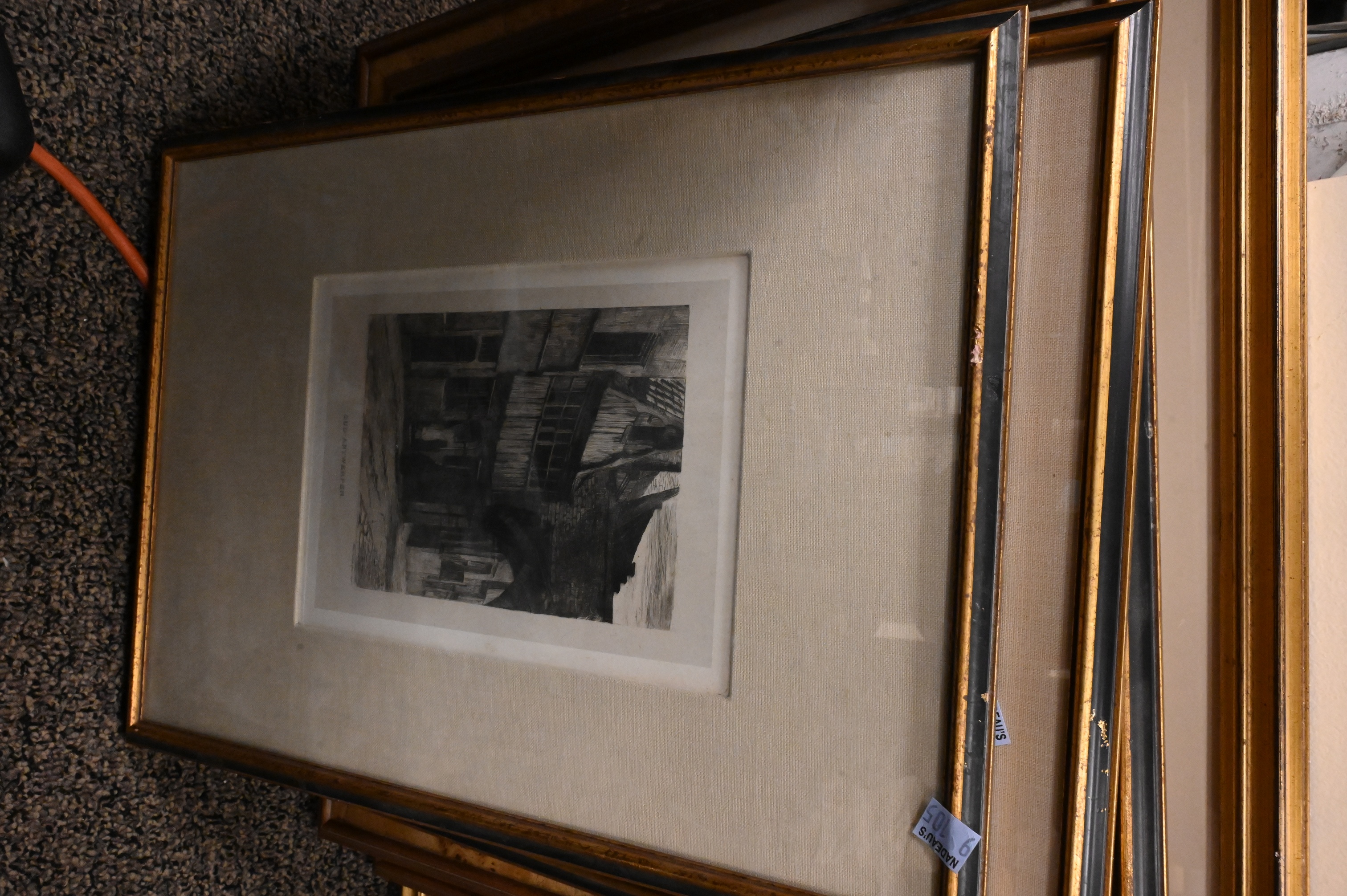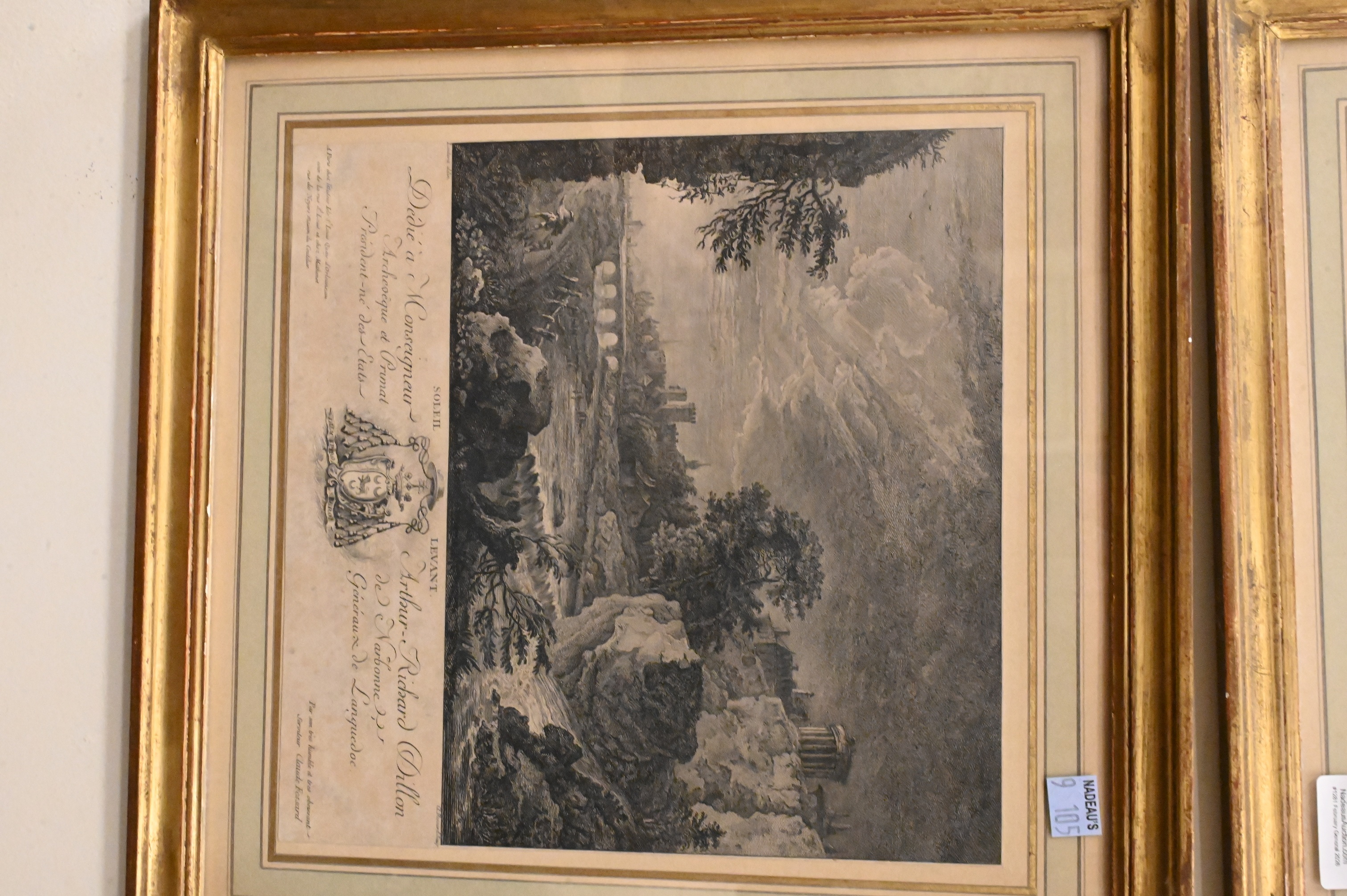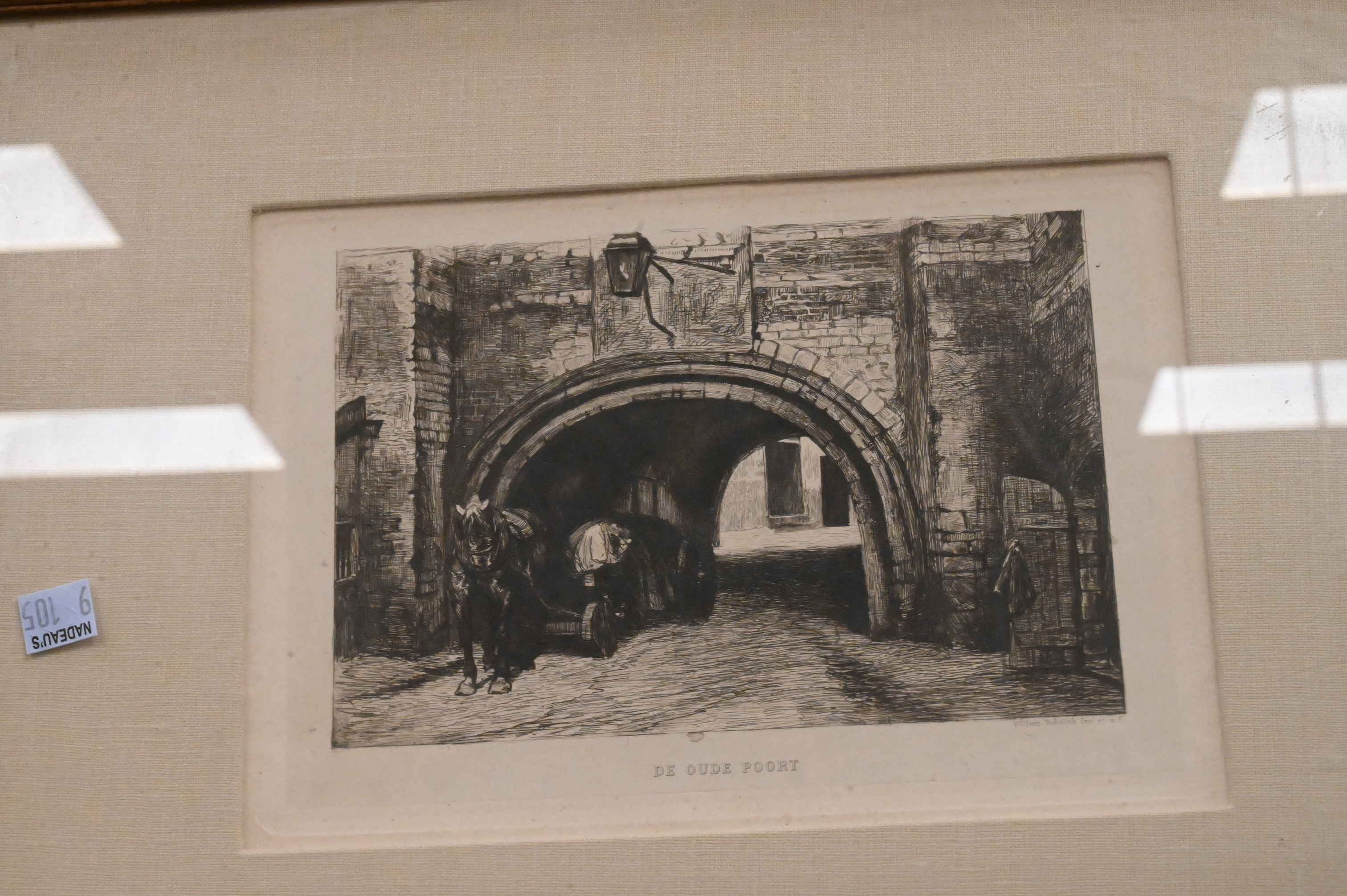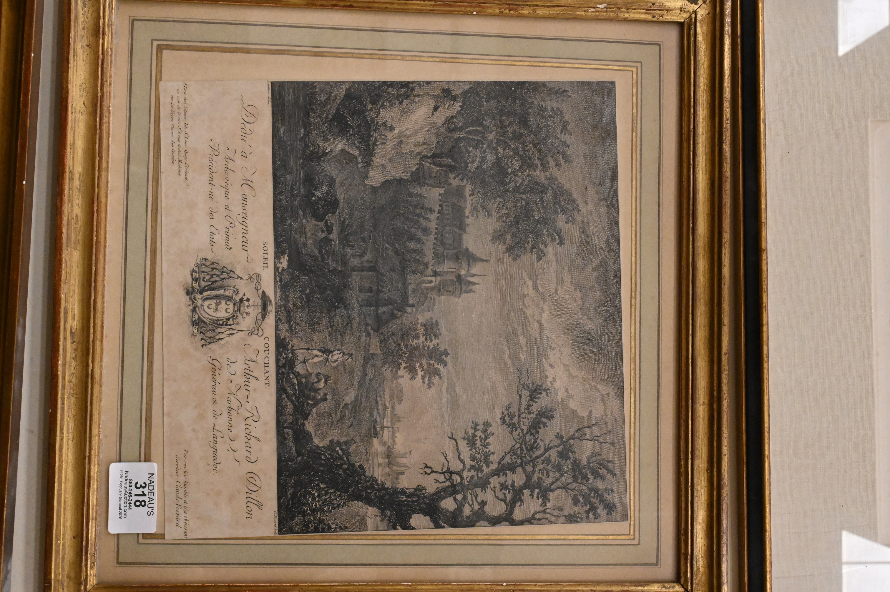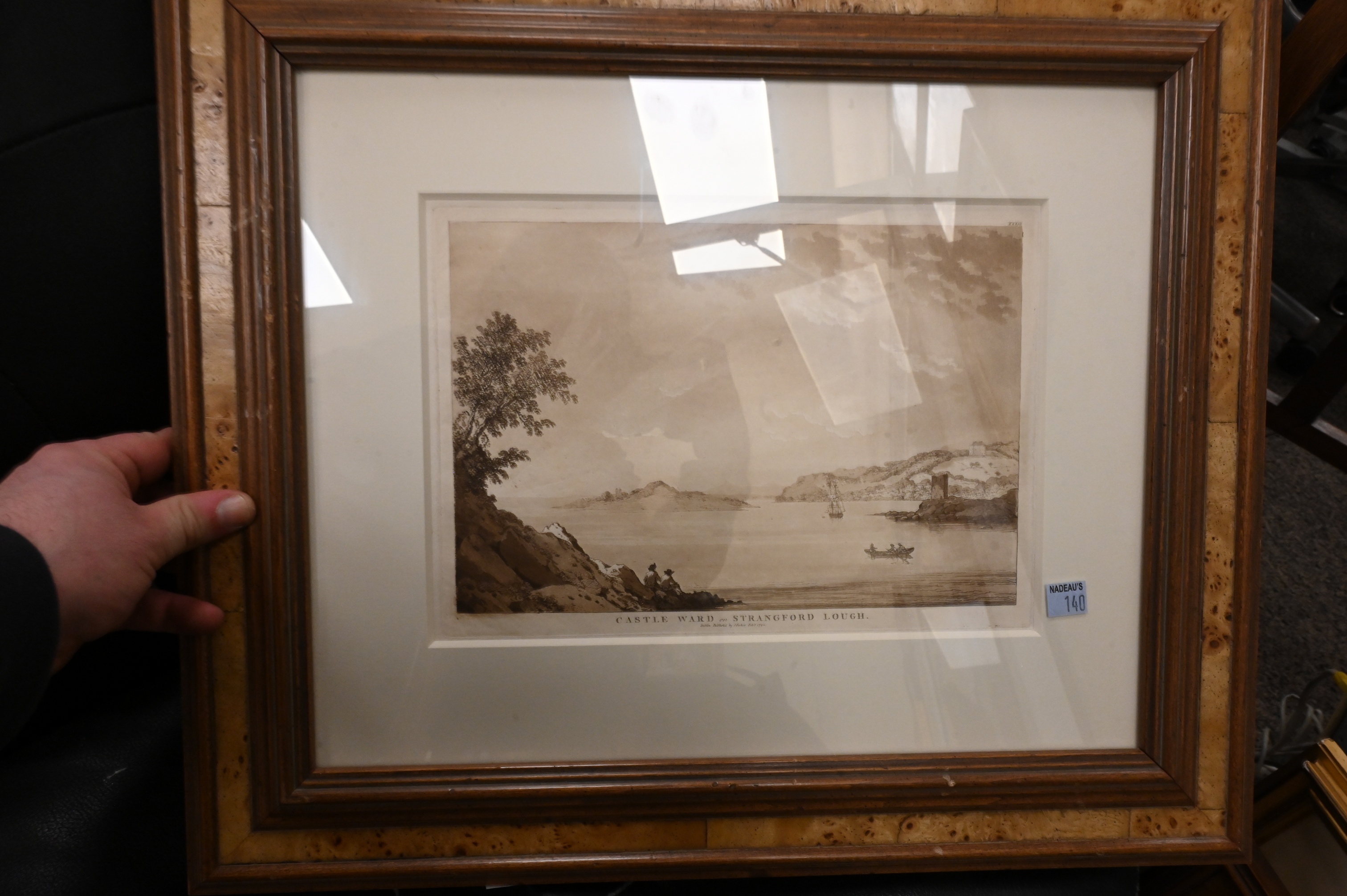 pair of Claude Fessard (French 1740–1803) “Soleil Couchant” and “Soleil Levant”, intaglio etchings, Maurice Rousseau, Paris gallery label verso, Castle Ward on Strangford Lough sepia etching, Antwerpen scenes, San Marco, Venice etc…