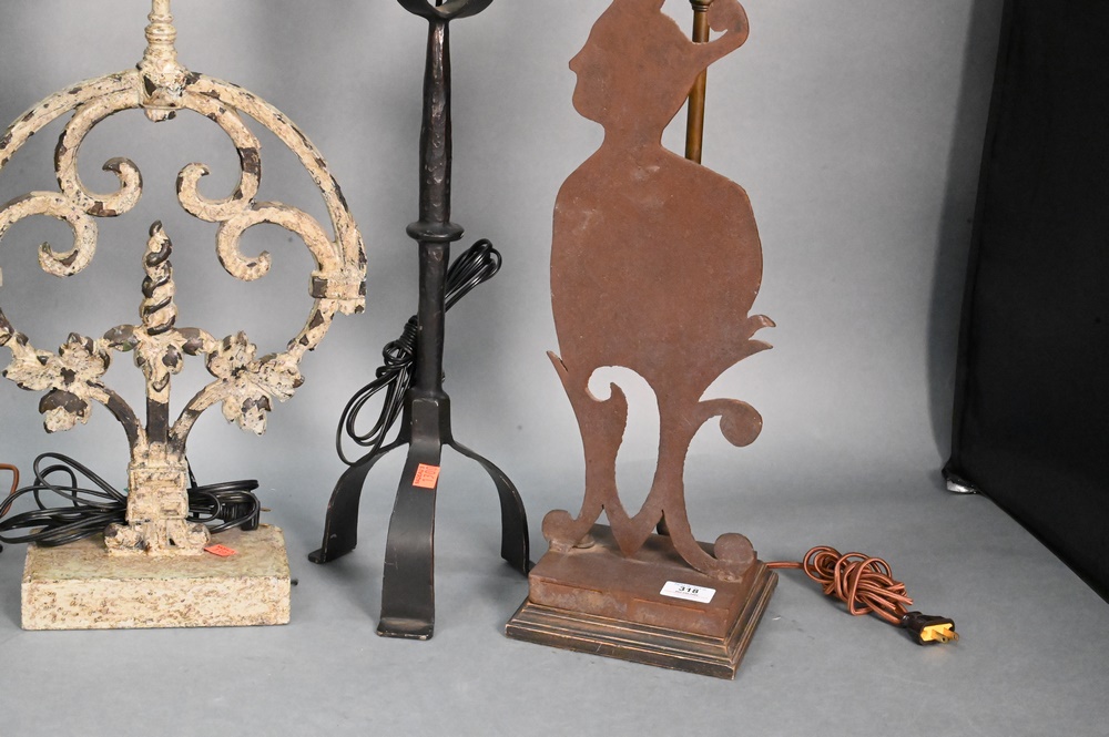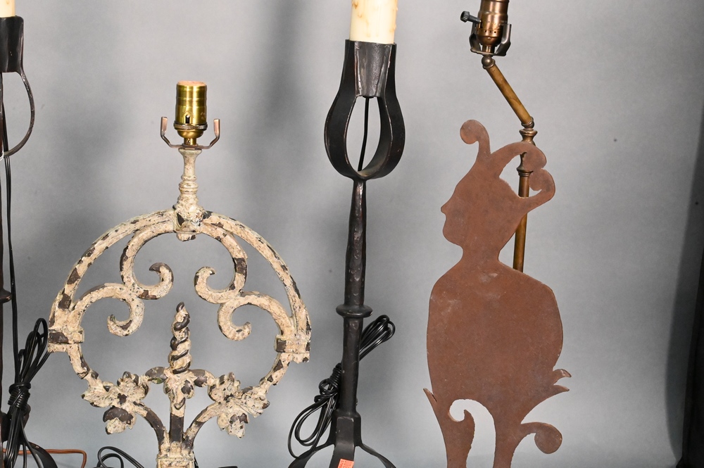 Group of Five Iron Table Lamps, to include pair of figural cut and sheet iron, a pair of candlestick form, along with a single, height 32 inches.