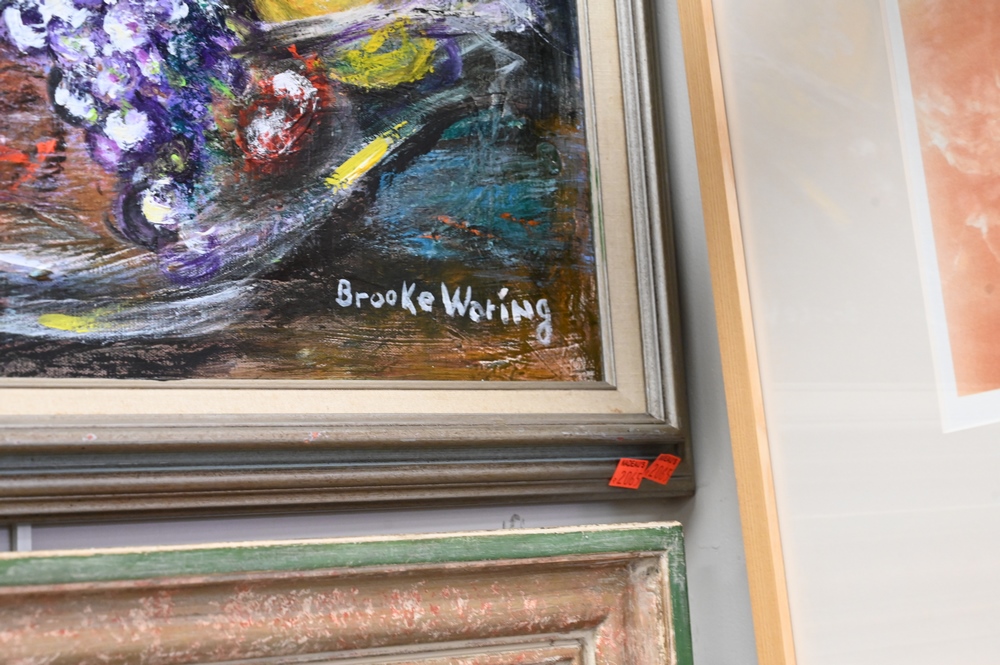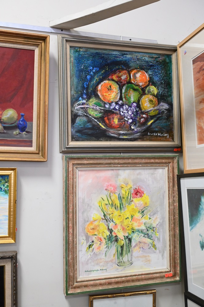 Lot 318: Group of Six Still Life Paintings, to include Brooke Waring, bowl with fruit, oil on canvas, 20″ x 24″; Adele Moros, Iris, watercolo…