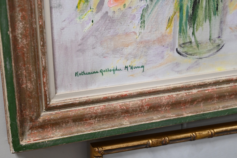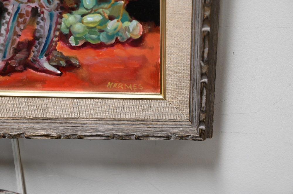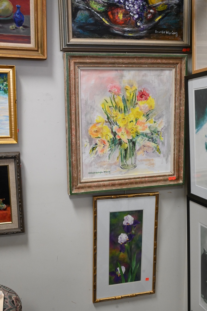 Group of Six Still Life Paintings, to include Brooke Waring, bowl with fruit, oil on canvas, 20″ x 24″; Adele Moros, Iris, watercolor, 16 1/4″ x 7 1/4″; still life of flowers and fruit, oil on canvas, 20″ x 22 1/2″; Hermes, still life with Oriental figure, oil on board, 11″ x 14″; Katherine Gallagher McNerney, oil on board, 20th century, flowers in vase, 21 1/2″ x 20″; along with an oil on canvas, signed illegibly, 11″ x 15″.