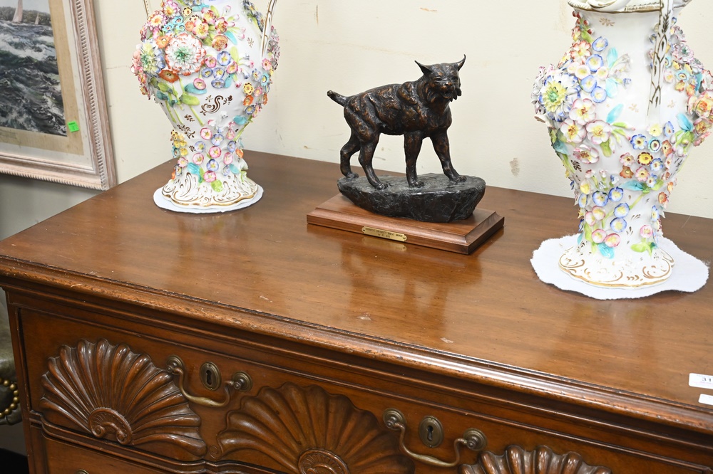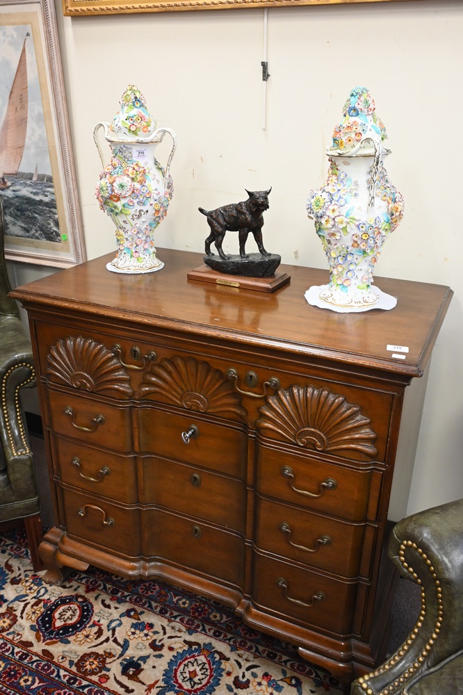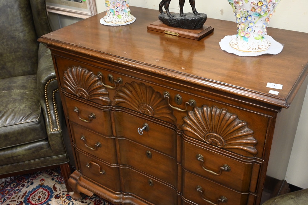 Lot 318: Kittinger Custom Mahogany Carved Blockfront Chest, Newport style, height 35 inches, top 20 x 37 inches, shows some wear.