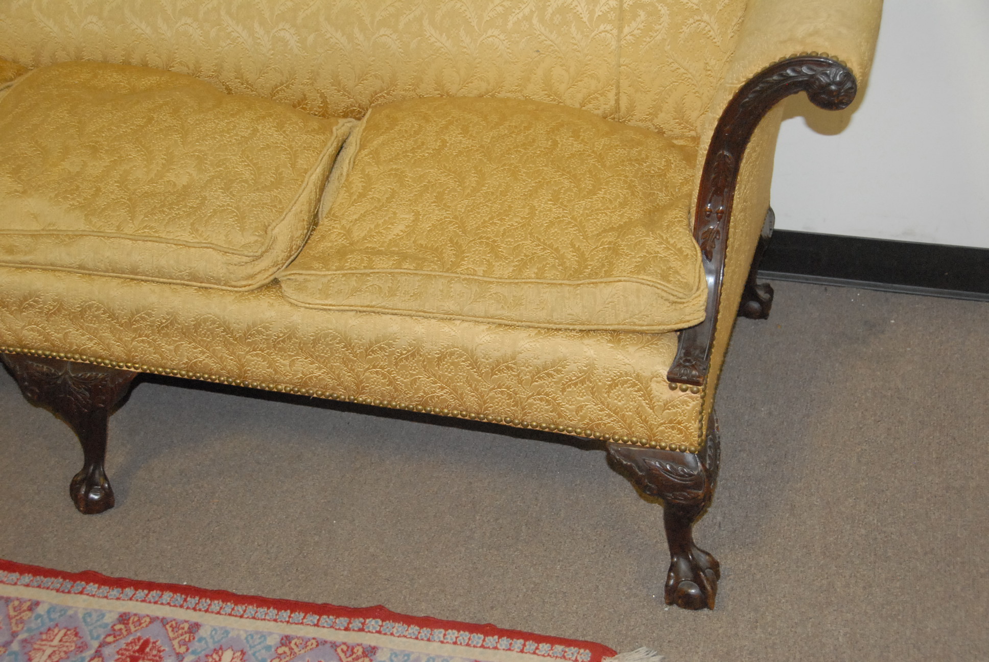 Mahogany Chippendale style ball and claw foot camel back sofa.