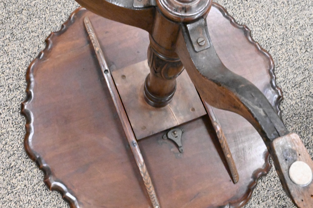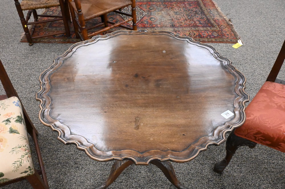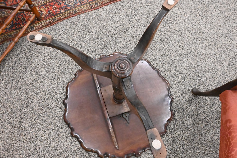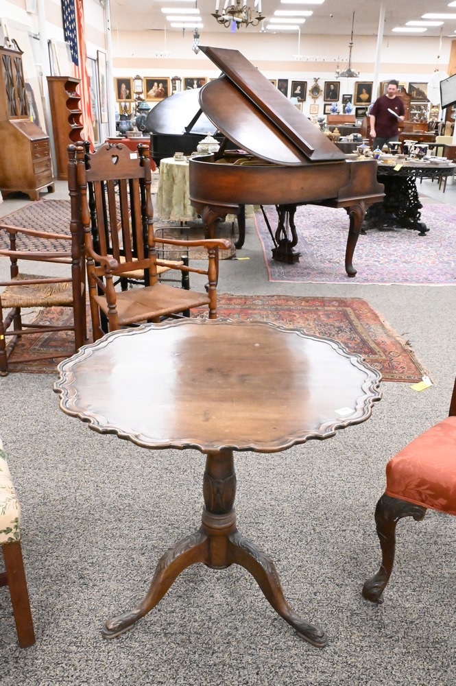 Lot 318: Mahogany Tip Table, having pie crust edge on carved pedestal and carved legs, ending in dolphin feet, height 29 inches, diameter 32 inches. Provenance: Lawrence Lomax Antiques, 1996.