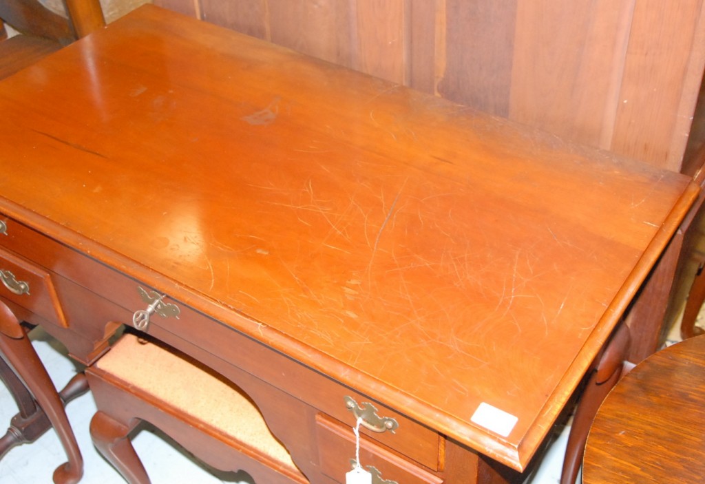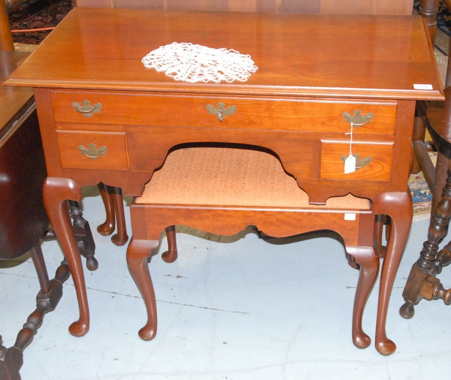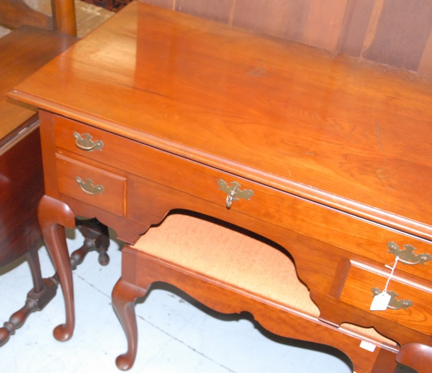 Margolis cherry vanity and bench, signed Margolis top heavily scratched. Vanity: height 30in. width 34in., bench: height 18in. width 25in.
