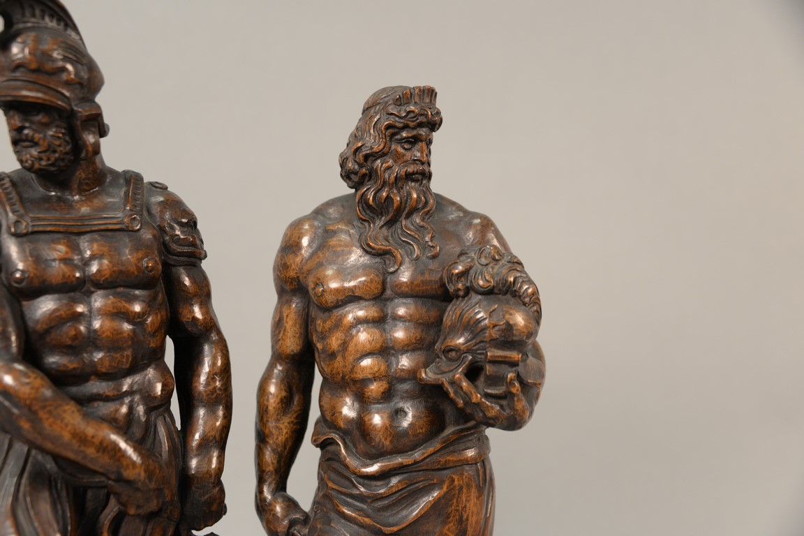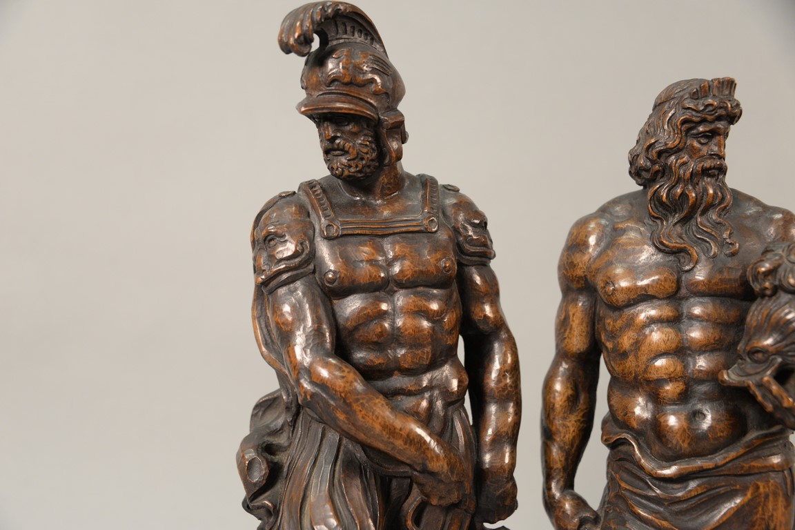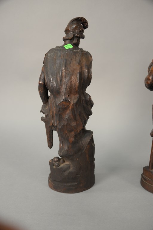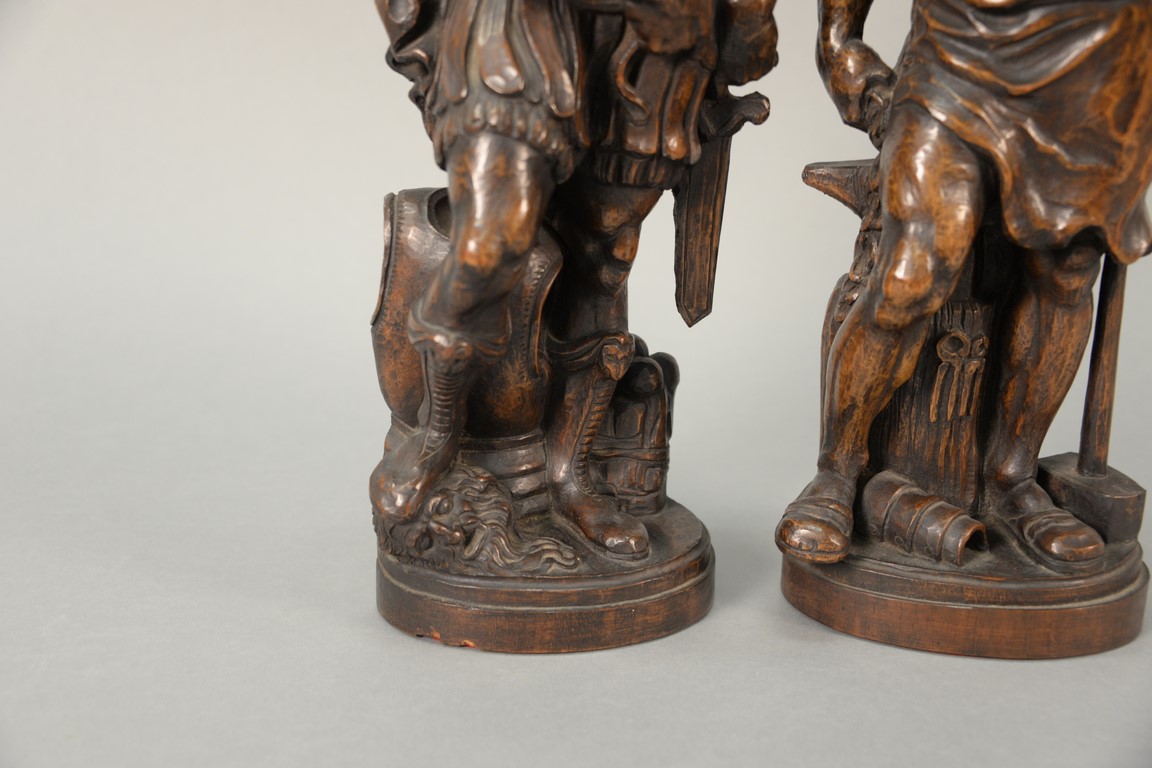Lot 318: Pair of carved walnut Greek warriors, possibly black forest, 19th century. height 19 3/4 inches