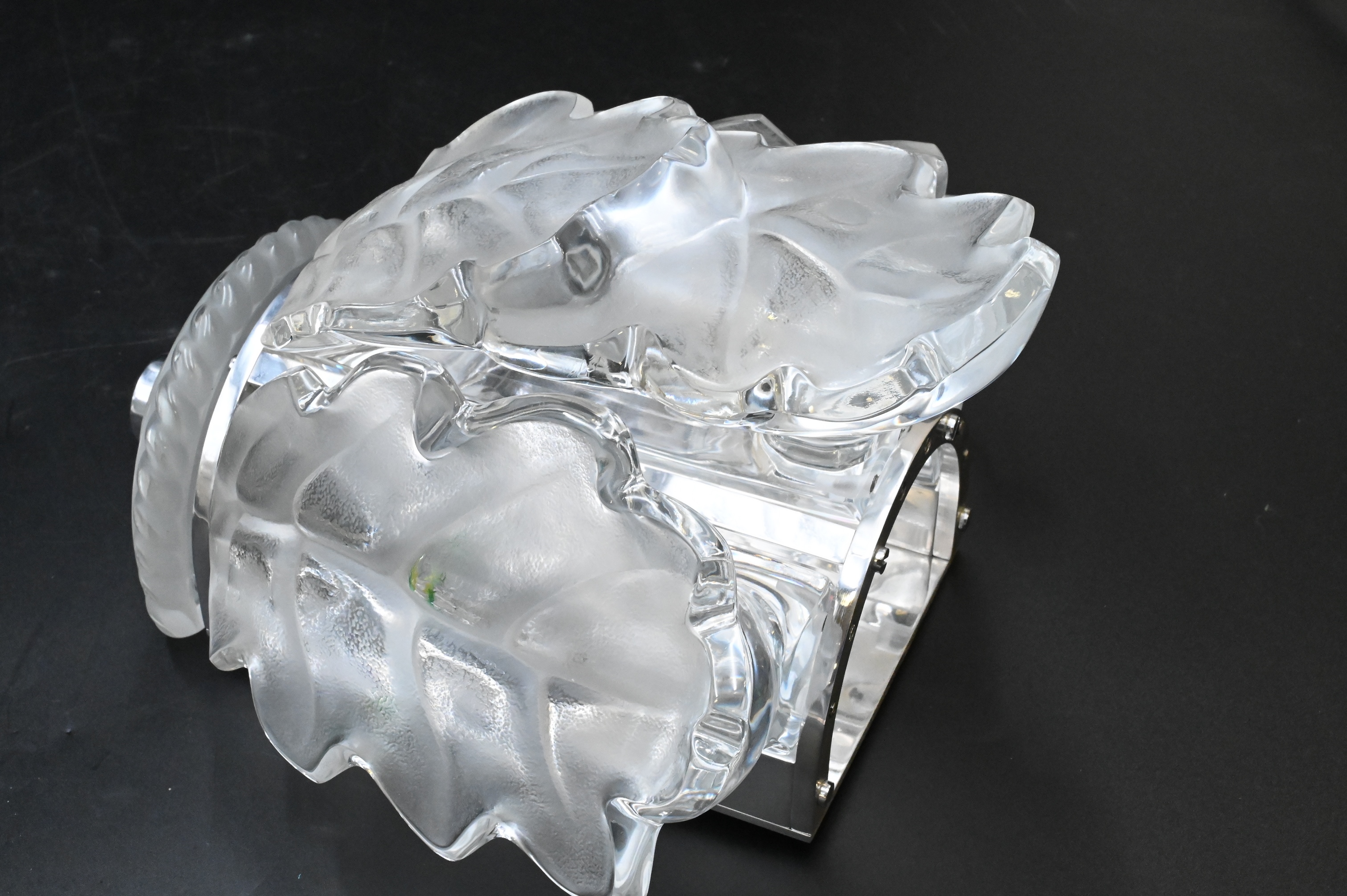 Pair of Lalique “Chene” Wall Sconces, each having three oak leaf form glass panels, chrome metal base, etched marking “Lalique”, height 11 inches, width 10 inches, depth 7 inches.