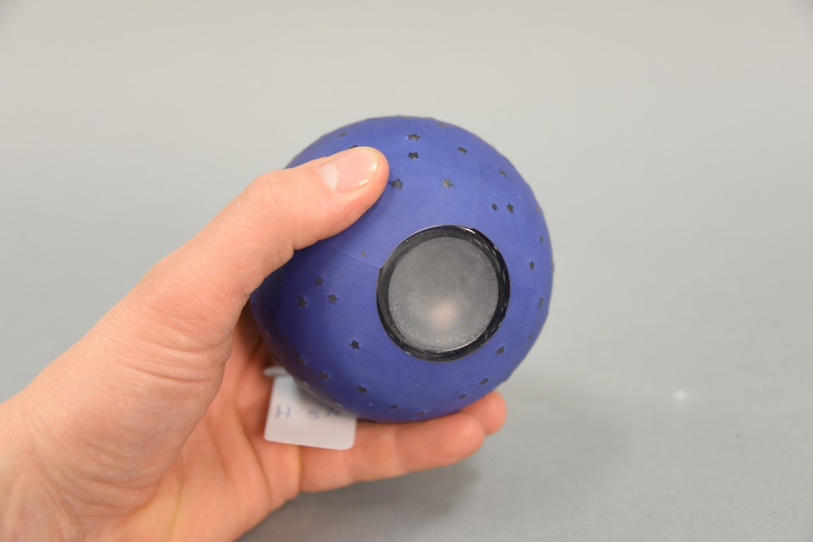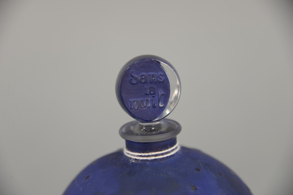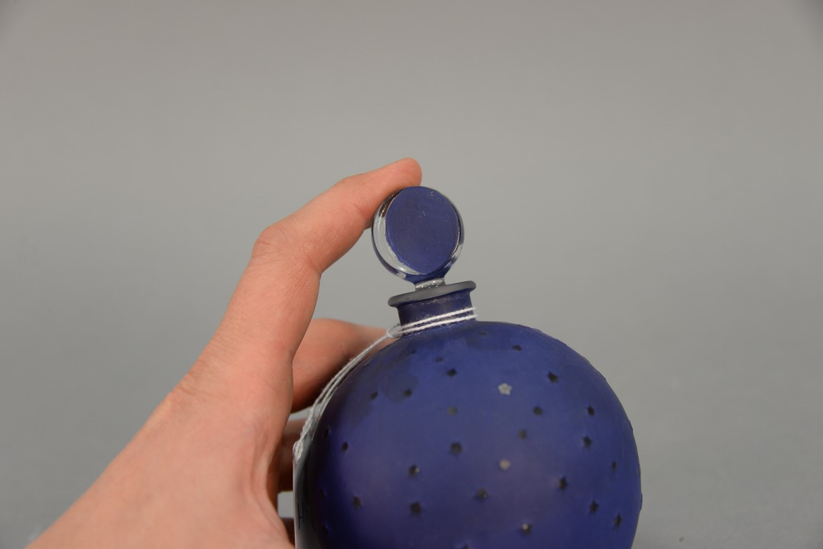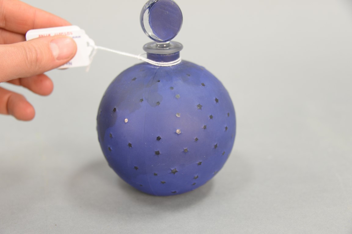 Lot 318: R. Lalique Dans la Nuit perfume for worth with deep blue enameled glass circa 1925, block letters: R Lalique, ht. 5 1/2in.