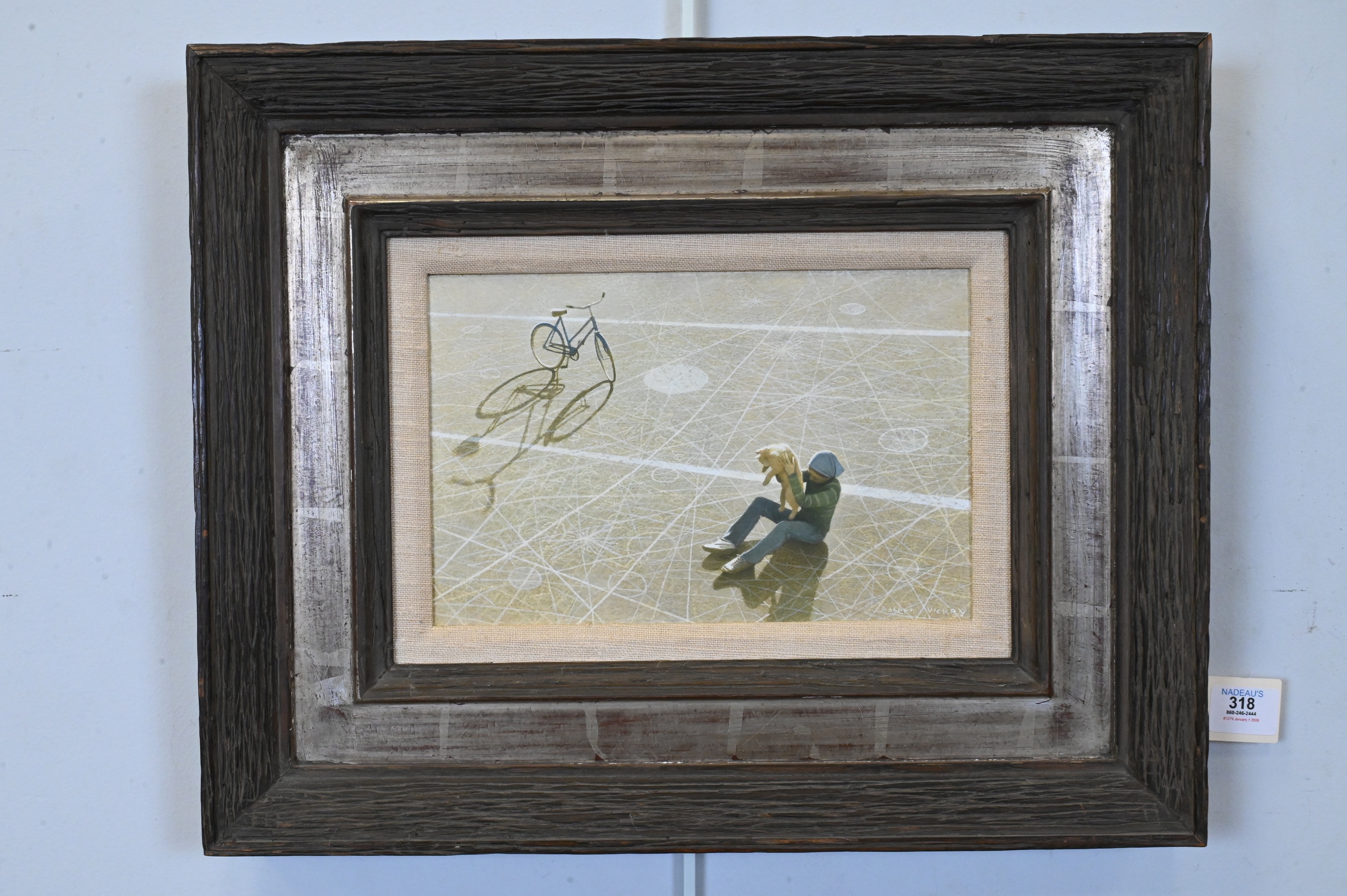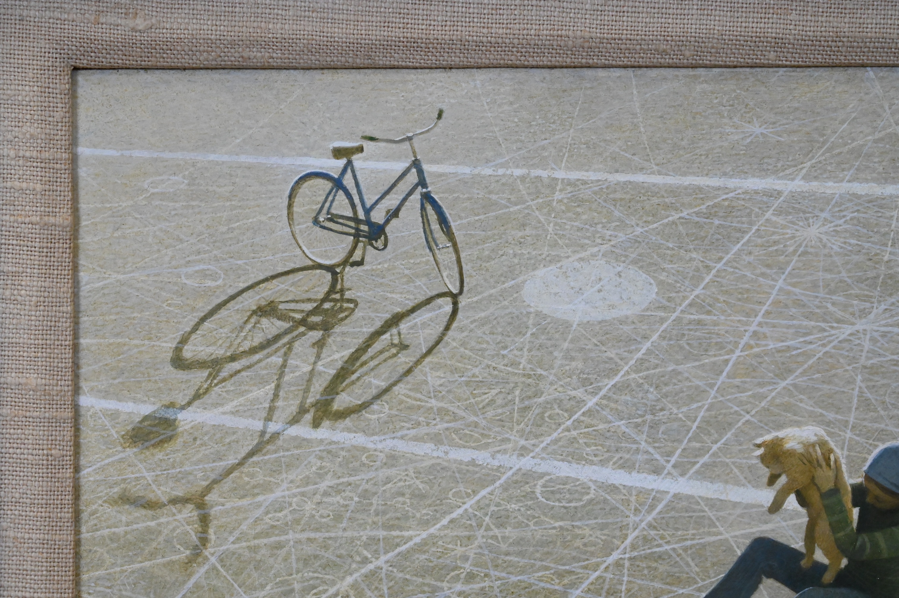 depicting a young girl seated on a sun-struck playground surface holding a doll, her elongated shadow cast across a complex web of chalk-drawn circles and lines