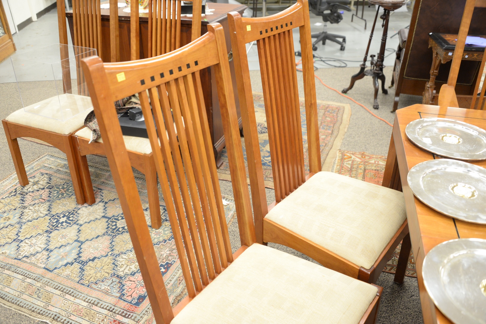 eight high back chairs with square spindles, and matching inlaid table, having two 15 inch leaves