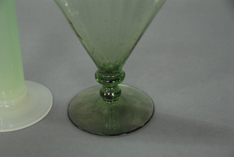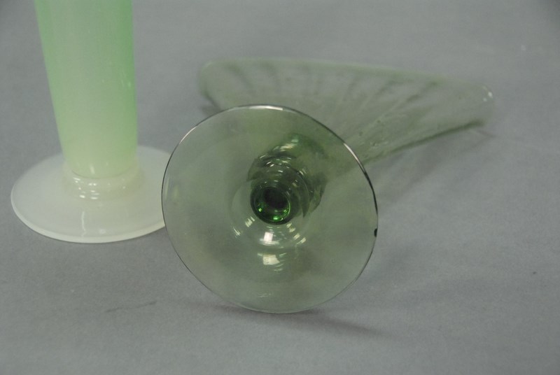 Lot 318: Two art glass vases to include Stevens & Williams art glass jade vase and green fan shaped art glass vase attributed to Steuben one flake on fan. ht. 8 1/4in. & ht. 12in.