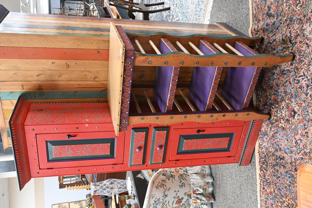 Two Piece Shoestring Creations Furniture Lot, to include an Etagere, along with narrow cabinet, heights 48 and 73 inches. Provenance: Estate of Peter Tillou, Litchfield, Connecticut.