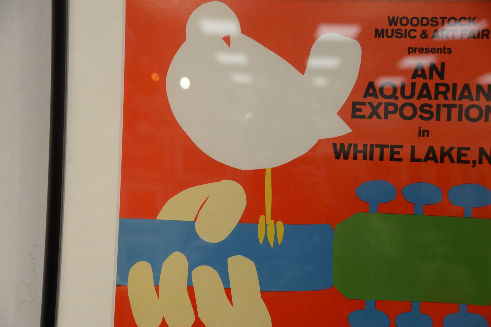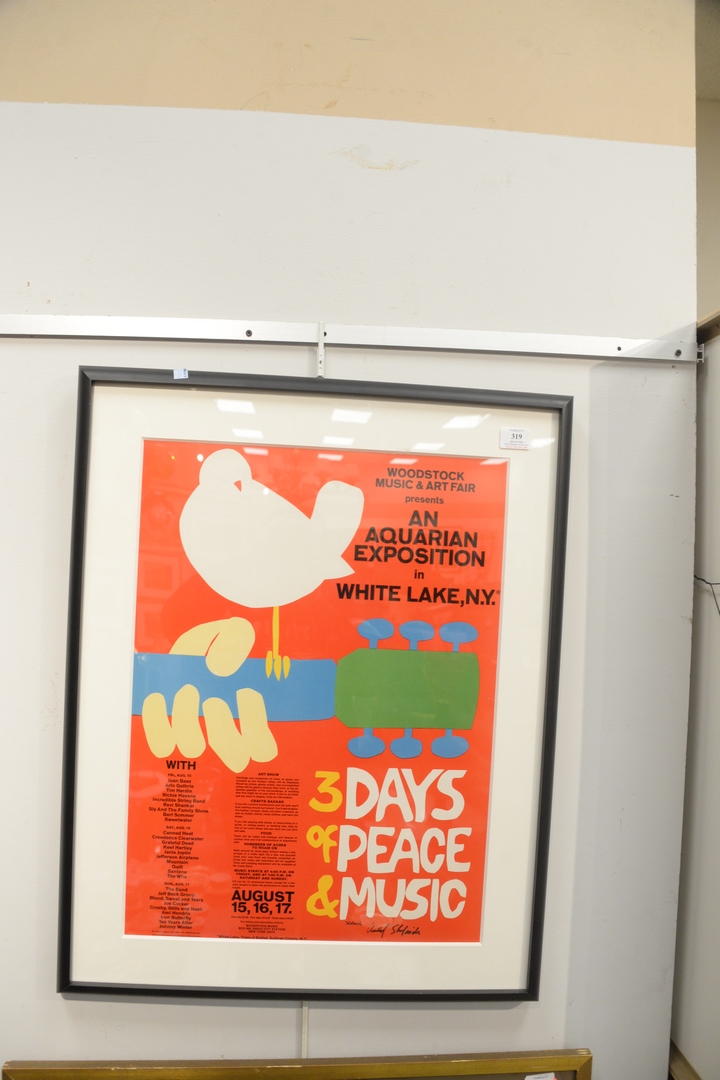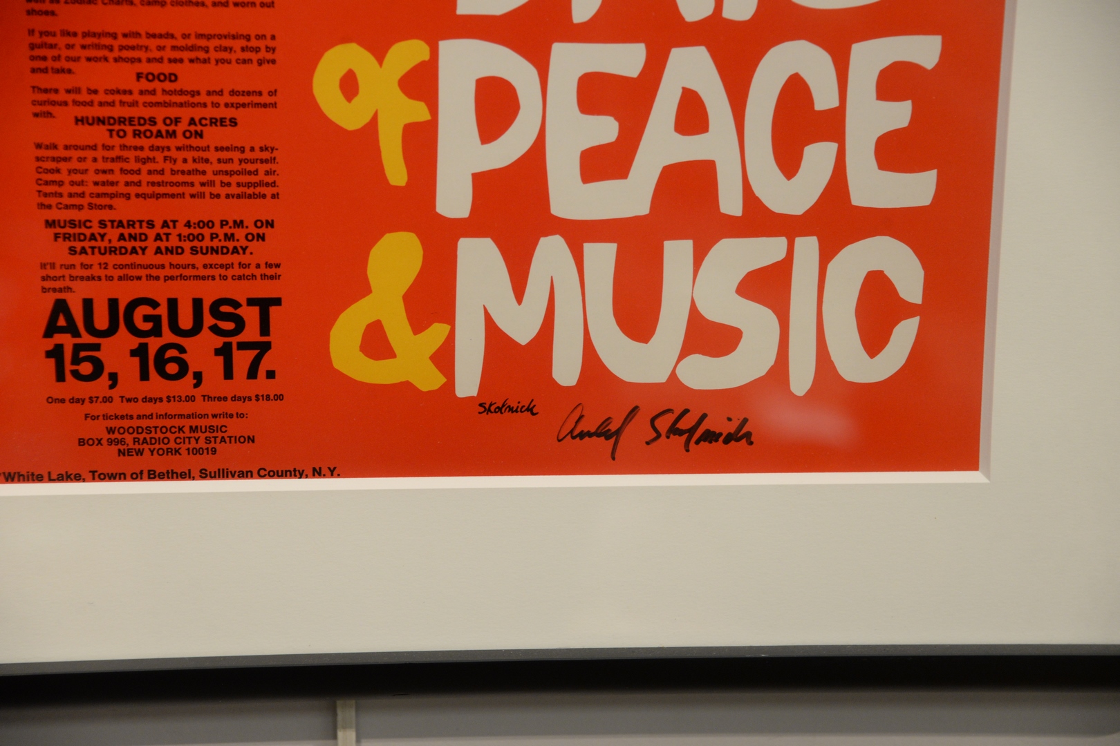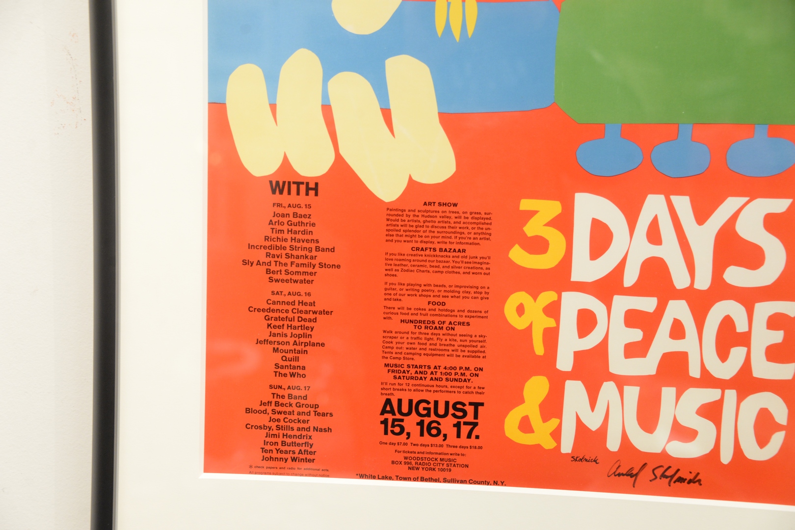 Lot 319: Arnold Skolnick (American, b. 1937), “3 Days of Peace & Music”, Woodstock Festival lithograph, in colors on paper, signed in ink lower center Arnold Skolnick, 24 1/2″ x 18″ (sight).