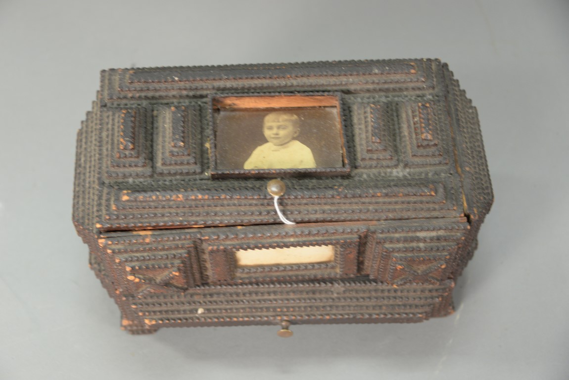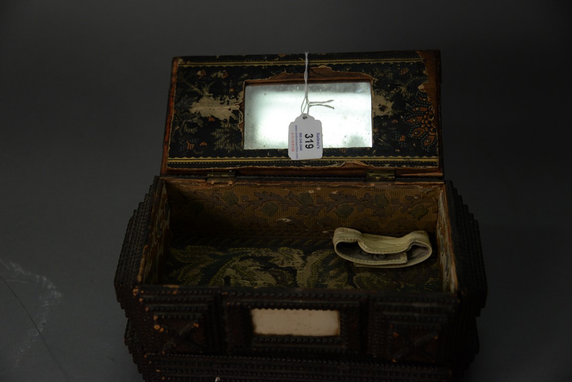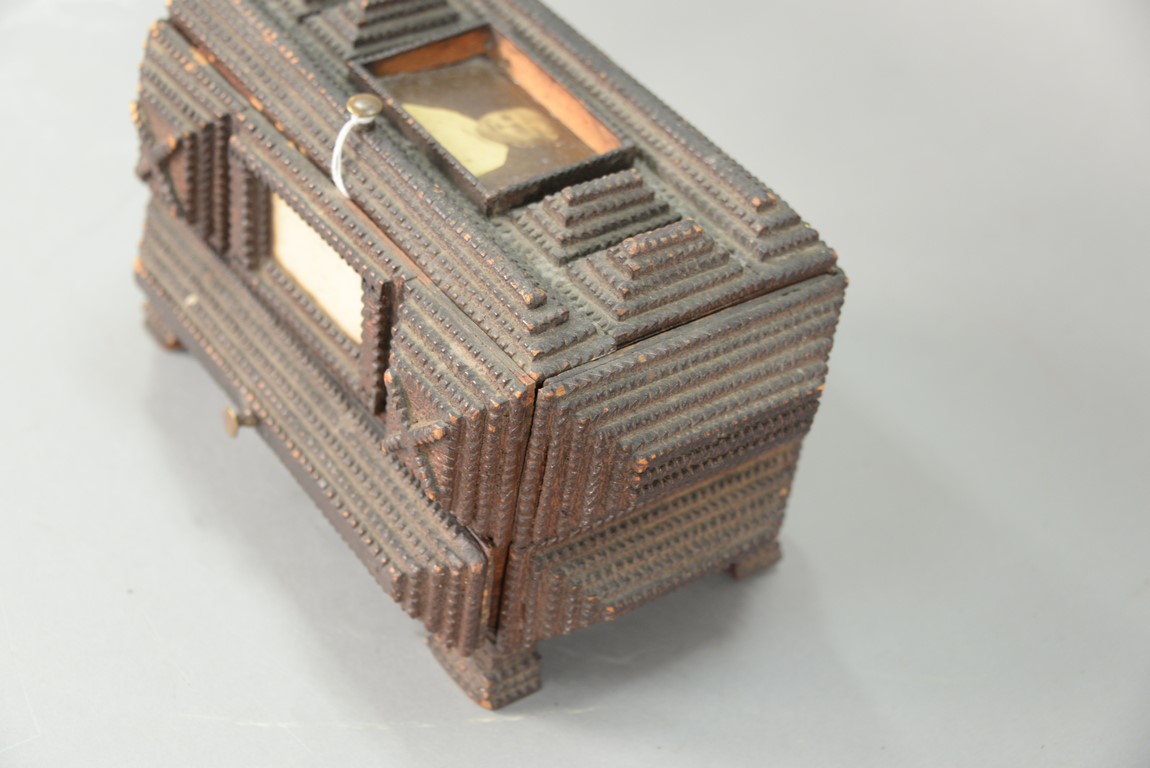 Lot 319: Chippendale carved tramp art jewelry box with lift top box over one drawer on four feet. ht. 6 in. lg. 11 in. dp. 7 in.
