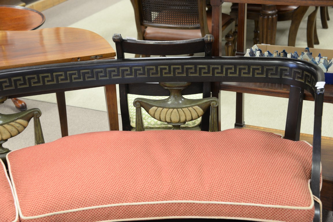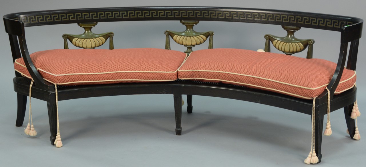 Lot 319: Custom Louis XIV style curved bench with painted urn back, caned seat, and square tapered and fluted legs. lg. 84in.