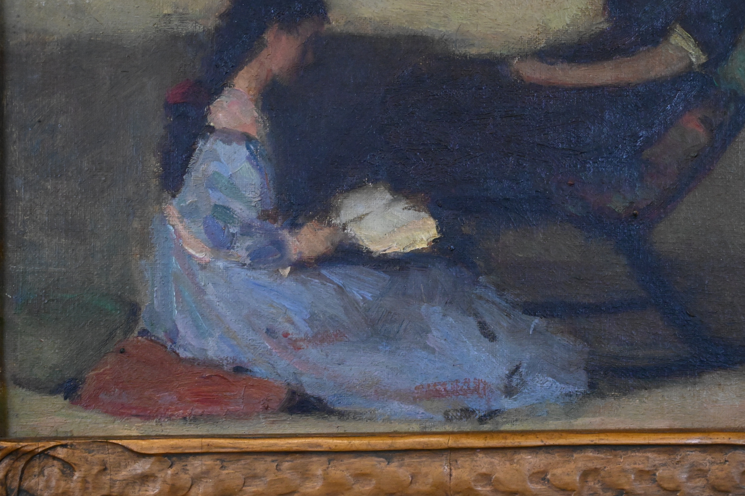Depicting a mother and daughter in a quiet interior, one seated reading while the other reclines