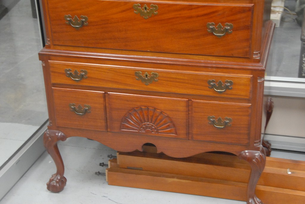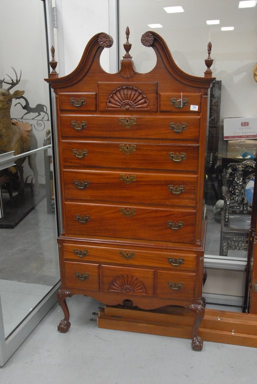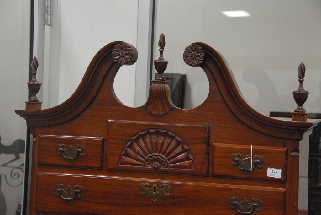 Lot 319: Fineberg Chippendale style highboy in two parts, upper section with broken arch top with three small drawers over four drawers on ba…