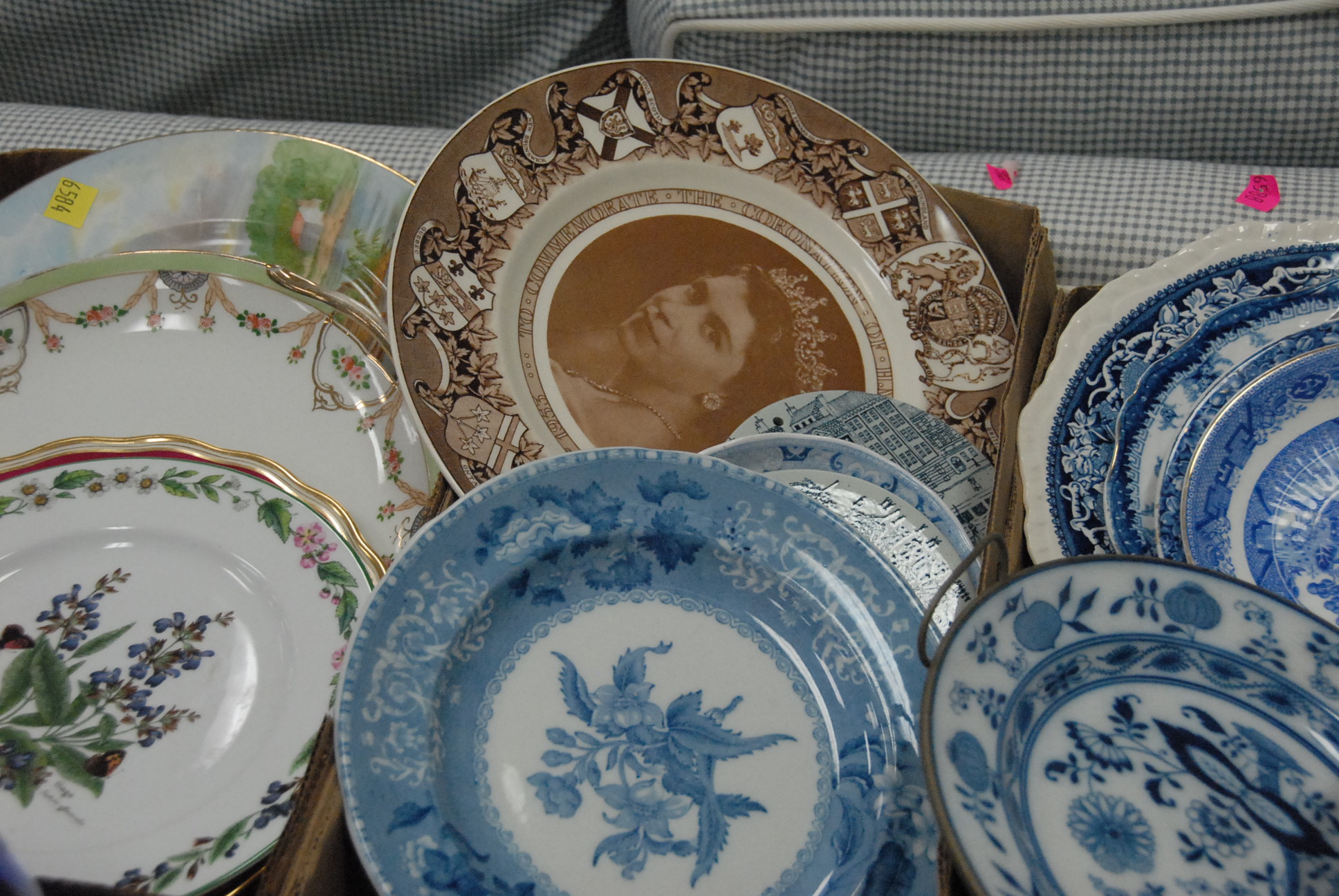Five box lots of plates hand painted plates, blue and white plates, Staffordshire plates, Royal Worcester plates, and miscellaneous china plates.