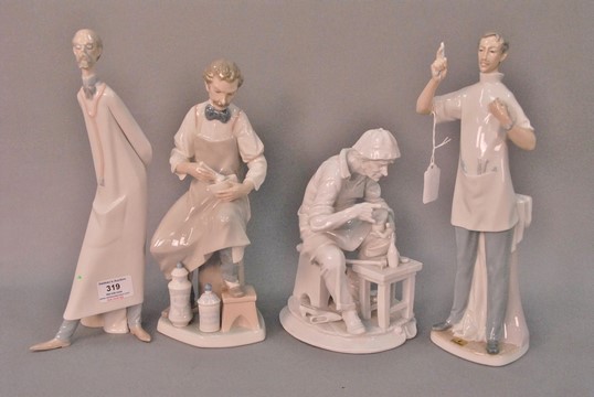 Four piece lot to include porcelain figure of a shoe maker ht. 9 1/2 in. and three Llardros Dentist ht. 13 1/2 in., Pharmacist ht. 12 1/2 in., and Doctor.