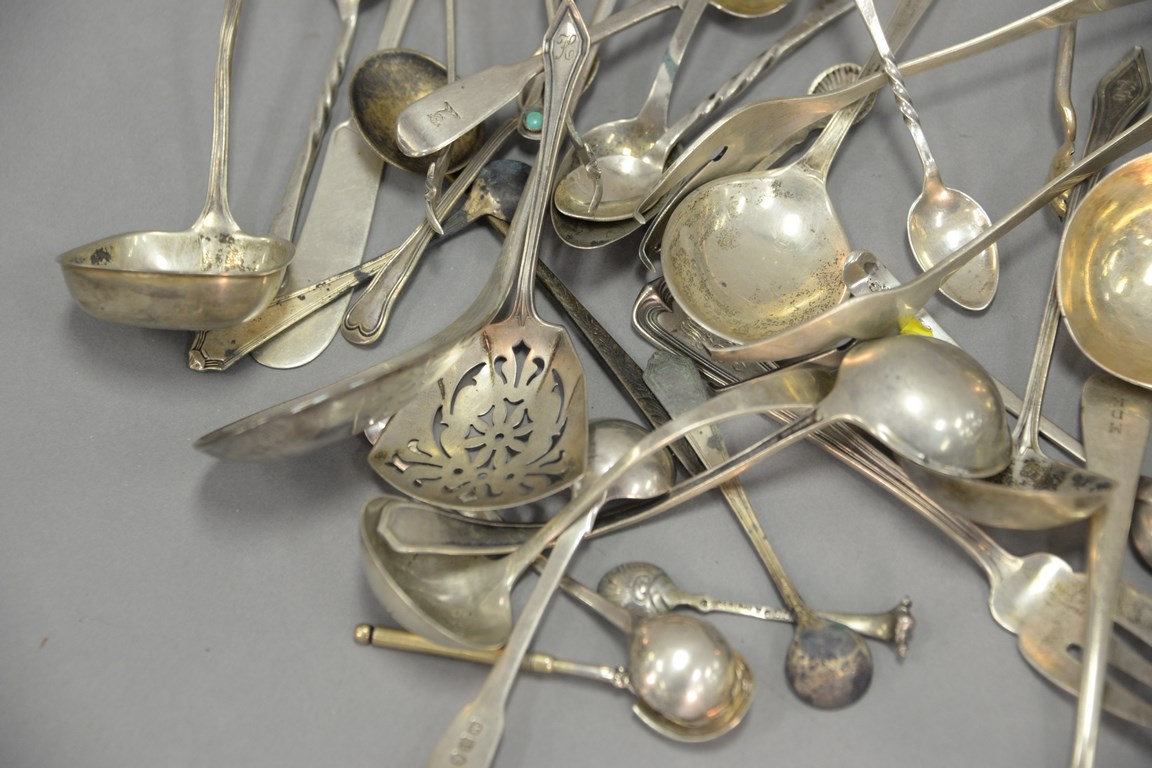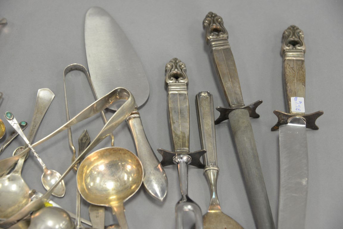 Lot 319: Group of sterling silver and coin silver flatware Georg Jensen ladle and three piece weighted cutlery set. 21.6 t oz. plus five weig…