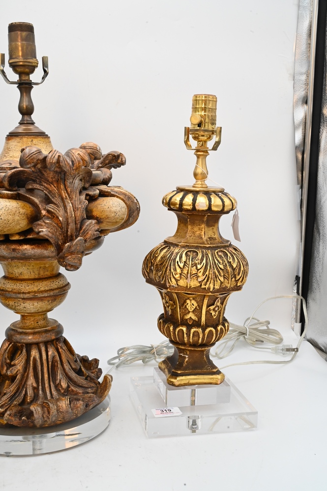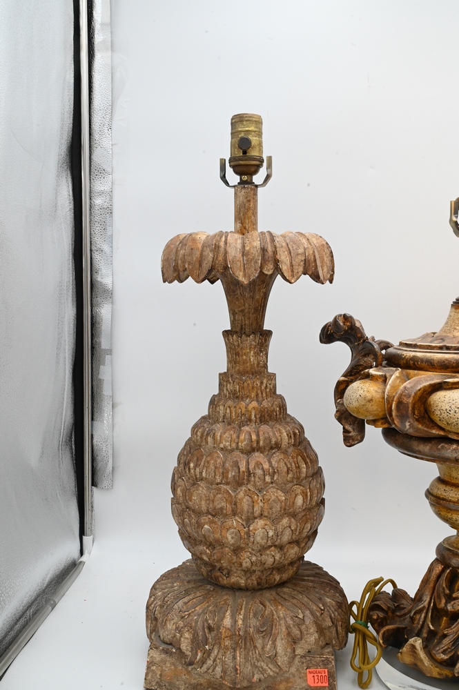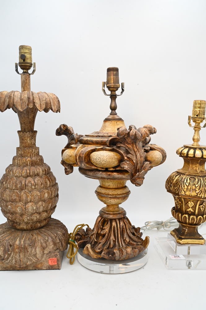Group of Three Carved Italian Wood Urns, made into table lamps, height 23 1/2 inches.
