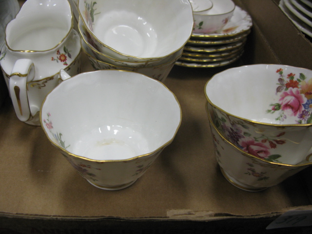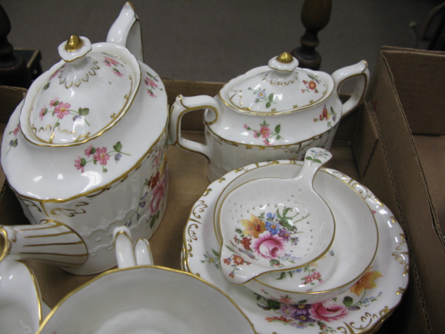 Royal Crown Darby tea set, 19 pieces teapot, sugar, creamer, strainer, waste bowl, 7 cups and 6 saucers, probably pose pattern.