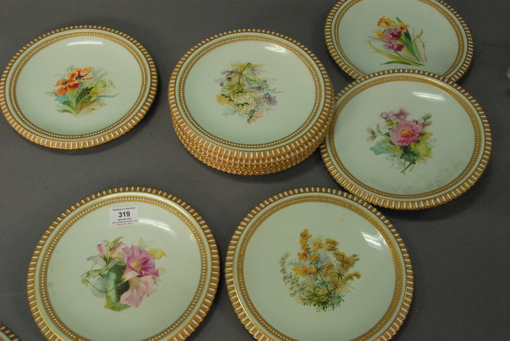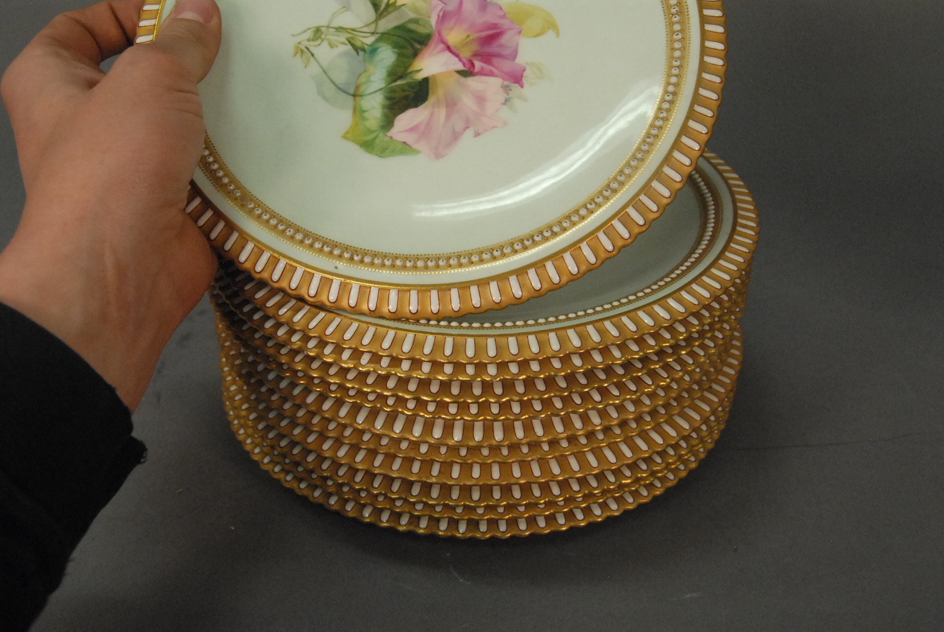 Lot 319: Set of eleven Worcester plates, each with raised beadwork and various hand painted flowers. dia. 9 3/8in.