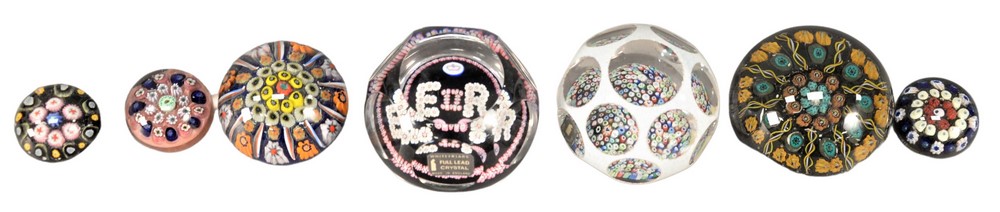 Seven Piece Group of Strathearn and Whitefriars Millefiori Glass Paperweights, to include two Whitefriars dated 1972 and 1977, along with five Strathearn, each with labels adhered. Provenance: Estate of James Wadhams.